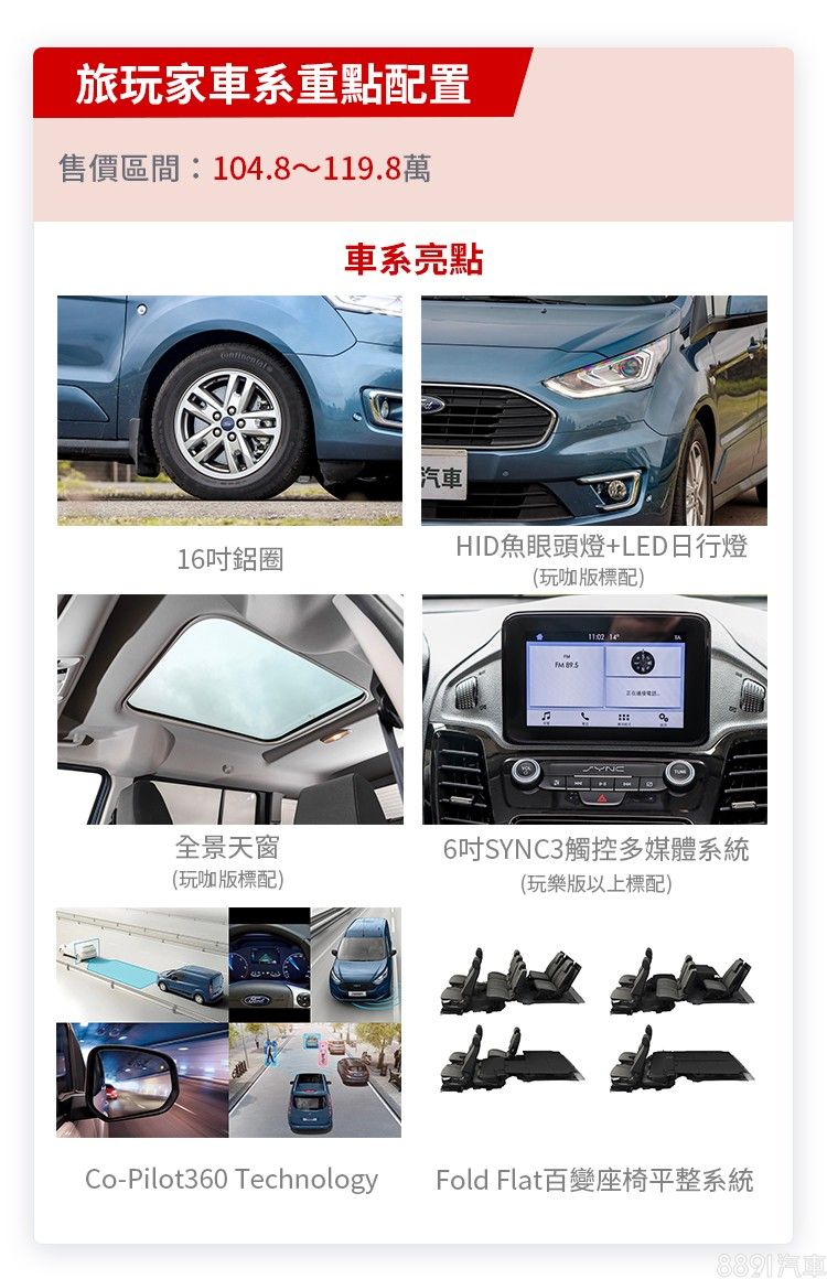旅玩家全車系標配16吋鋁圈、鹵素頭燈等,並將標配Co-Pilot360 Technology系統視為一大賣點,玩樂版以上增列6吋SYNC3觸控螢幕、智慧手機連接、倒車顯影等,頂規再追加HID魚眼頭燈、LED日行燈、自動遠光燈切換、全景天窗、雙區恆溫空調、側風穩定系統等配備,3車型中以玩咖版最貼近家用買家需求。