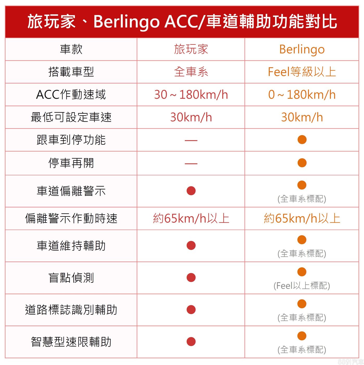 旅玩家全車系標配Co-Pilot360 Technology系統,ACC雖非全速域,但對應多數用車環境也不成問題;Berlingo駕駛輔助系統要到Feel版本以上才較為完整,不過其ACC作動範圍為0~180km/h,具備跟車到停的功能,當遇到走走停停的車流時,便利性更勝一籌。