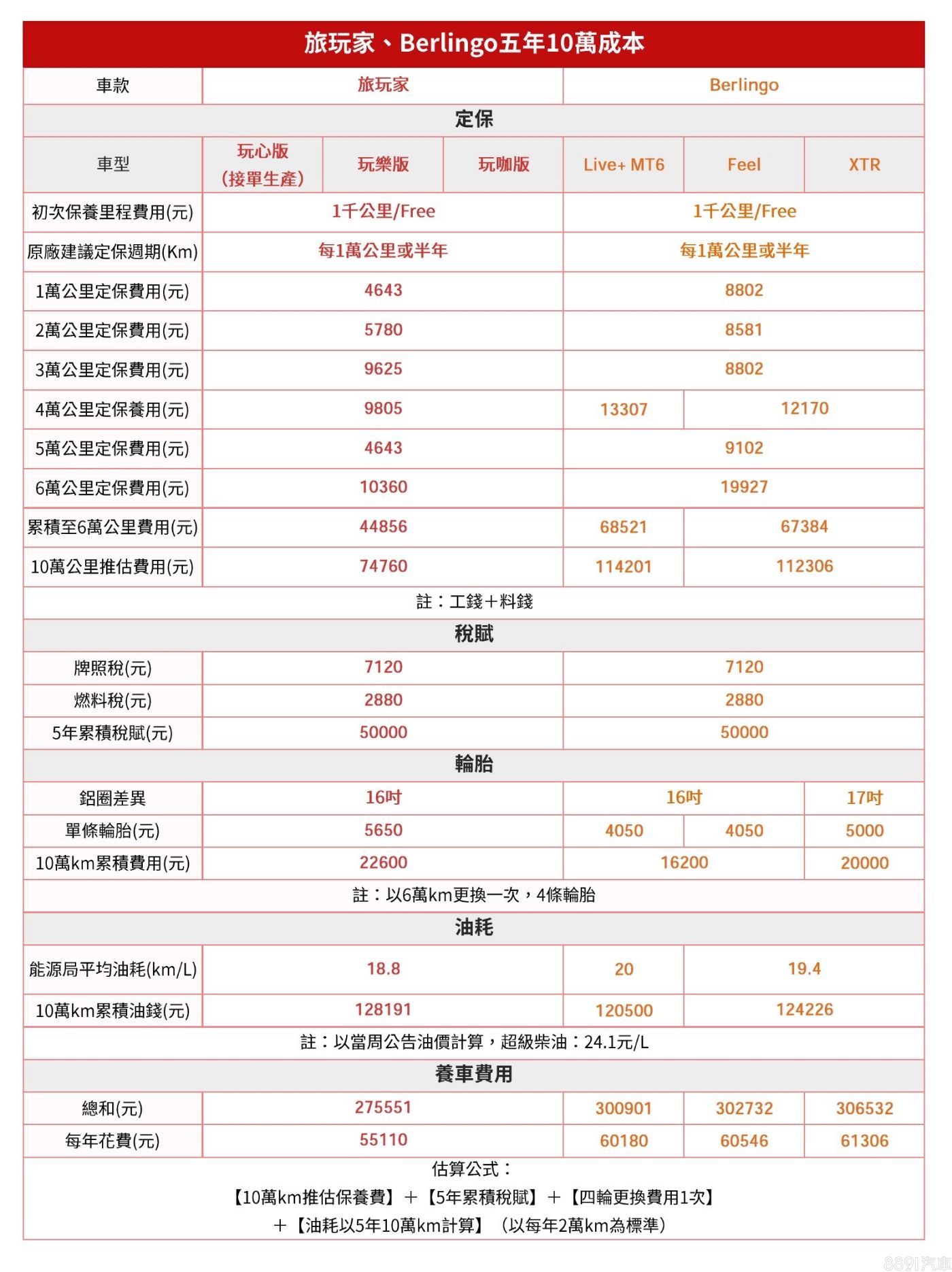 兩車稅賦同樣落在1.2~1.8升區間,每年須繳的牌燃稅相當,油錢與更換輪胎成本,則以Berlingo較省,不過若是將定保費用納入考量,旅玩家明顯便宜許多,綜觀下來,每年約可比Berlingo省下約5千元的養車成本,雖說費用差距沒有想像中「驚人」,但長年下來亦是一筆不小的開銷。
