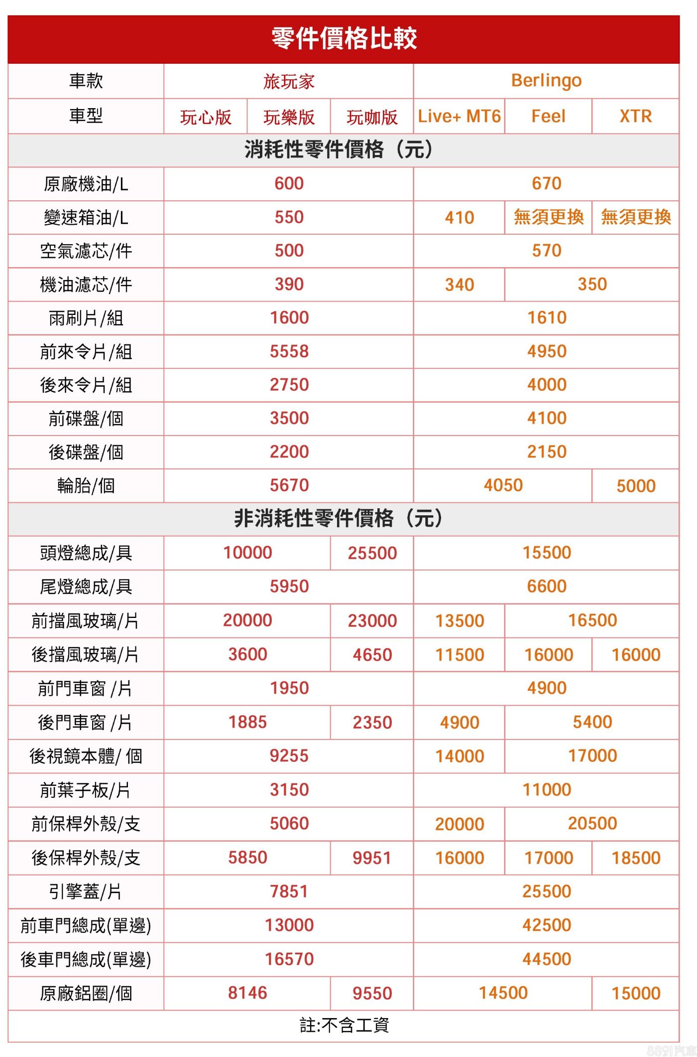 從上表可以發現,兩車在消耗性零件上差距不大,甚至在有些項目,旅玩家還小貴一些,不過若是望向非消耗性零件,Berlingo這部分的花費明顯多出不少,諸如後擋風玻璃、前後保桿、引擎蓋、車門等部件的價格都是旅玩家的2~3倍,倘若需要修車時,花費恐會是一大負擔。