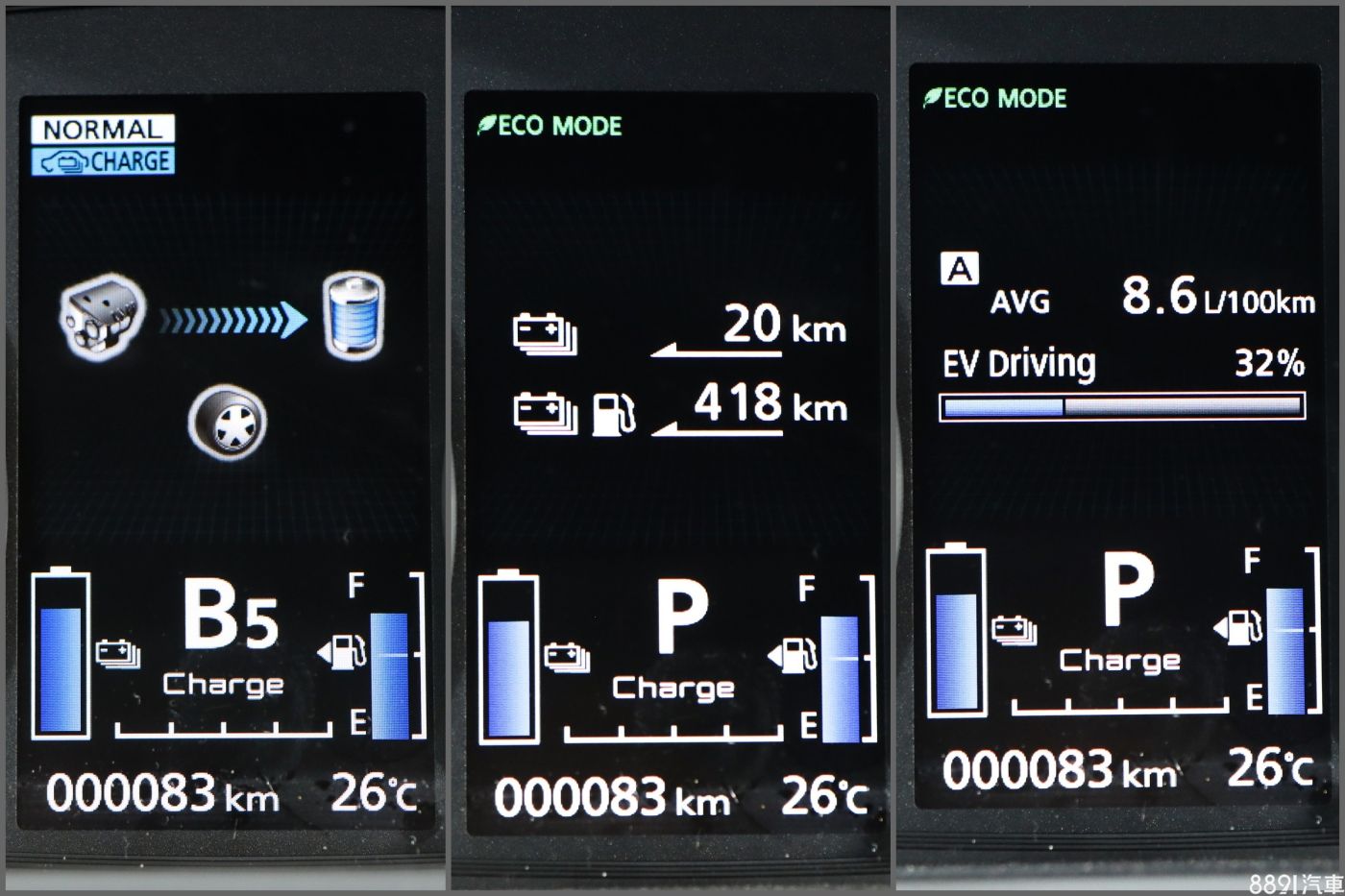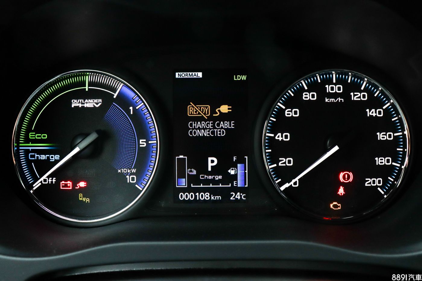 除了顯示當前汽油量及儲電量,亦可切換為動力流向、純電及油電模式之續航里程、旅程純電行駛比例等資訊。除了EV純電模式外,Outlander PHEV具備「Charge充電優先」及「Save電量保留」模式,各模式可於排檔座按鍵切換,並於儀錶資訊幕左上角顯示當前模式;Charge將強制啟動引擎並即時為電池充電,Save則會保留電力在切換模式時的水準。