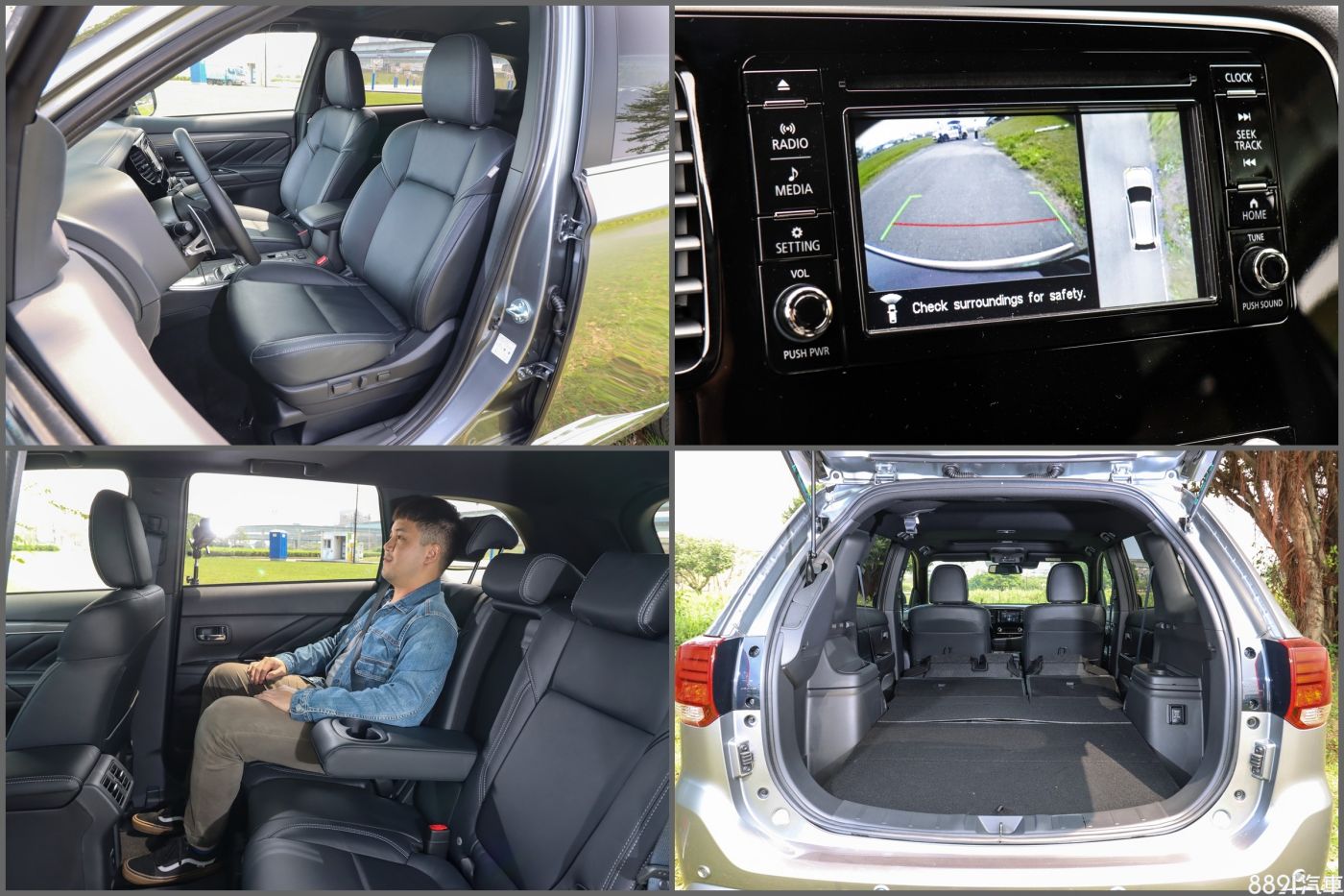 Outlander車系本身車室空間就有不錯表現,乘坐空間未因油電化而有所犧牲,加熱雙前座及電動調整駕駛座皆同小改前入列標配,不過新款並追加2個USB插孔滿足充電需求。原廠雖未公佈尾廂容積數據,但在增加後軸馬達後,Outlander PHEV空間表現目測與7座國產版相當,並能在後排完全傾倒後提供相當平整的尾廂空間。