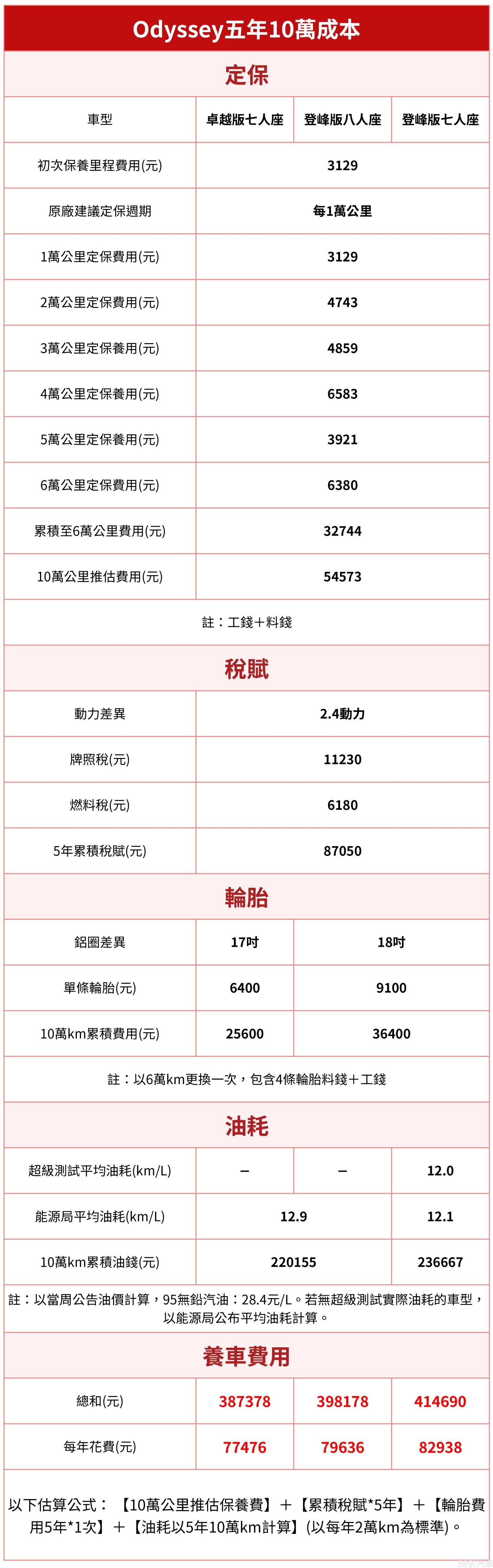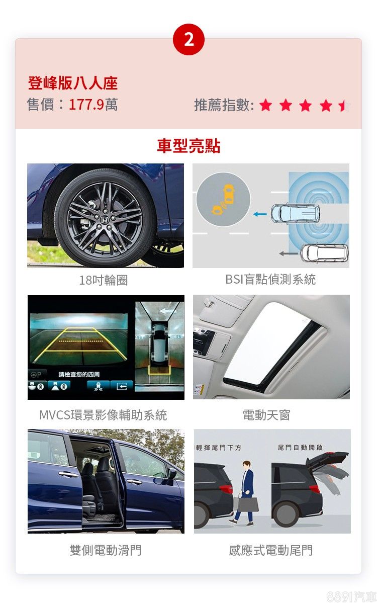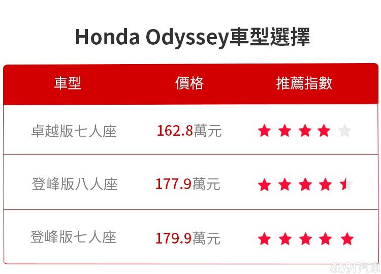 卓越版雖已擁有Honda Sensing、8吋車機、液晶儀錶等,但進階登峰版可進一步獲得雙側電動滑門、電動尾門、三區恆溫空調、360環景等配備,會挑MPV的人,對於舒適度皆有一定要求,且Odyssey瞄準的是有一定經濟能力的客群,十多萬的價差可以讓舒適度大幅提升,因此登峰版的推薦指數較高,而登峰版七、八人座的配備雖然大致相同,但登峰版七人座的第二排座椅是最大賣點,如果不是真的有承載八人需求,登峰版七人座是最推薦的車型。