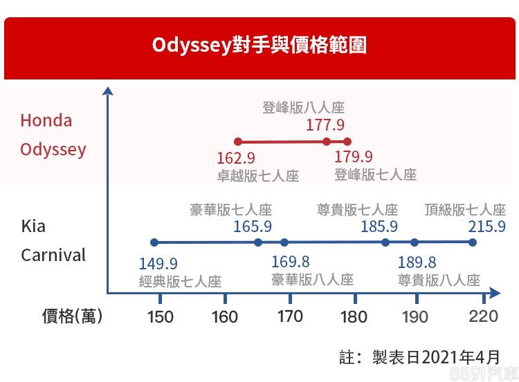在Toyota Previa、VW Sharan相繼退出台灣市場後,目前200萬內MPV選擇實在不多,撇開售價差距較大的Luxgen M7 Turbo(94.5~113.9萬),Odyssey目前頭號對手就是雖然車格大一號、但價格帶重疊的大改款Kia Carnival,相對之下,Odyssey雖然價格帶沒那麼寬廣、入手價也較高,但Carnival要到185萬以上的級距才有更豐富配備,Odyssey把頂規價格壓在180萬內並不會太吃虧。