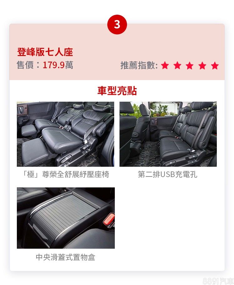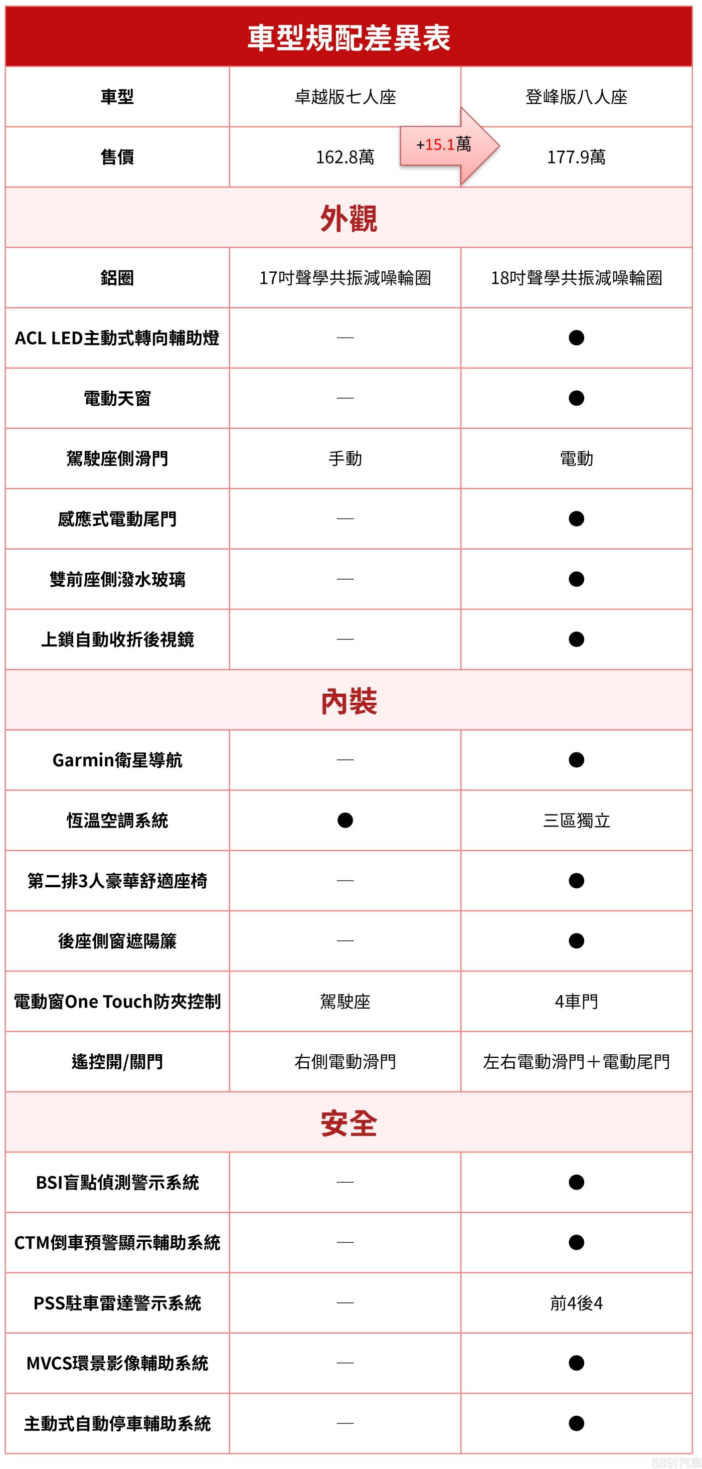 來到登峰版八人座,18吋輪圈、雙側電動滑門、電動尾門、360度環景等配備都補齊,安全部份也多了盲點偵測、倒車預警,與卓越版15.1萬的價差都是在相當實用的地方,對於駕駛或乘客都能實質感受到便利性的差異,也因此推薦指數較高。