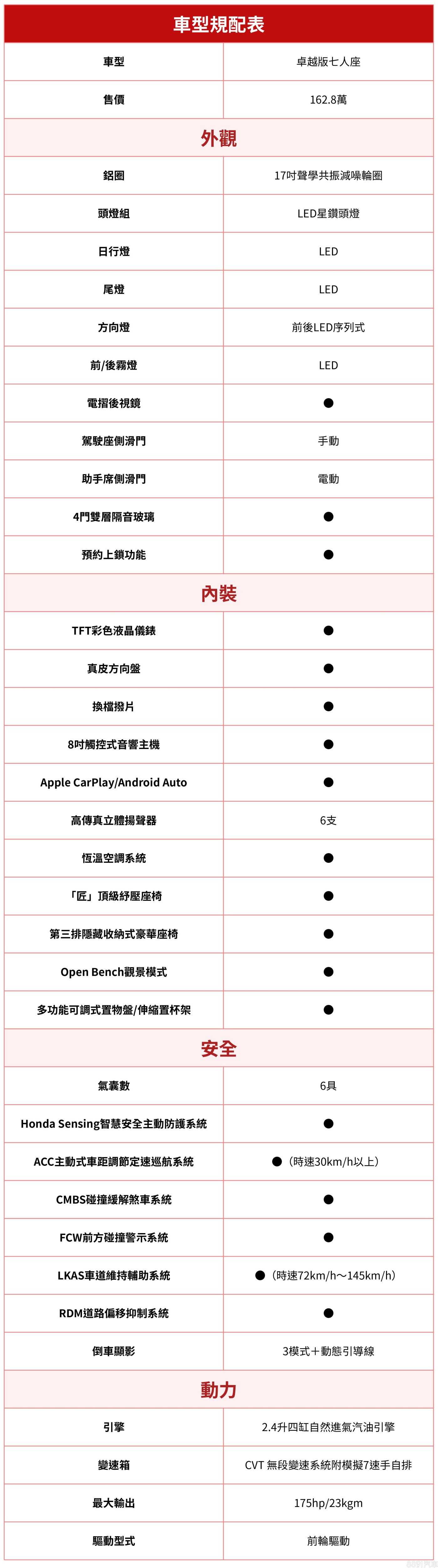 雖然較小改款前價格有所上漲,但作為入門車型的卓越版七人座其實有不少新配備,Honda Sensing、全LED燈具、雙層隔音玻璃、8吋螢幕等配備都是全車系標配,但電動滑門僅有右側且無電動尾門,第二排座椅也並不是最頂級的「極」尊榮全舒展式紓壓座椅,對於以便利、舒適為主要賣點的MPV來說,就是少了一味。
