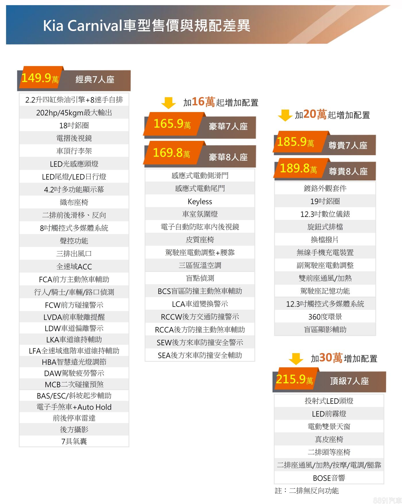 Carnival大改款開出四種配備等級,並於豪華、尊貴兩車型加入八人座選項,在配備方面全車系標配過往所沒有的Level 2半自動駕駛、主動煞停、自動遠光燈等市場主流配備,補齊了過往不足之處,但要享有更便利的用車體驗,建議要買到豪華型以上,多出BCS主動盲區煞停、RCCA後方主動煞停之外,電動尾門、三區恆溫空調、電動座椅也是重點配備,以整體配備、價格分佈來看,豪華、尊貴兩款就是Carnival主力販售車型。