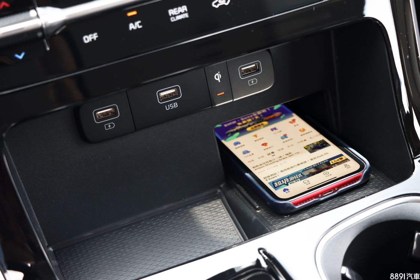 螢幕下方規劃有無線充電區域,配合無線Apple CarPlay能讓車上達到「真無線」環境,看起來整潔清爽,除無線充電之外,也有USB、USB快充接口,讓副駕駛座也能享有充電功能。
