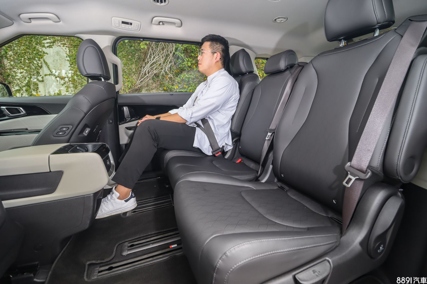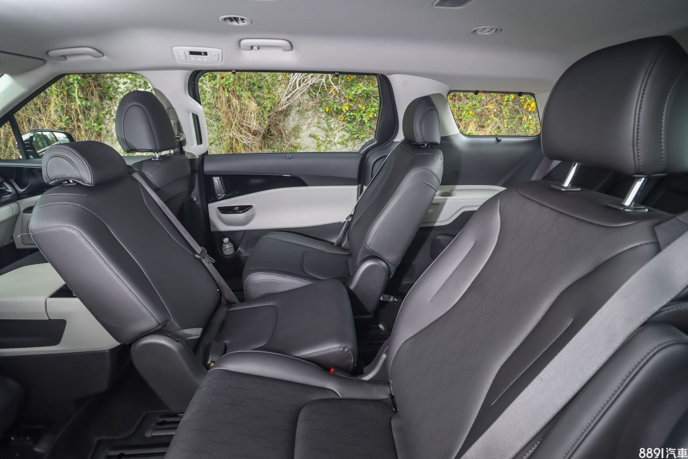 本次試駕車款為八人座車型,第二排採三張座椅佈局,對於人口數較多的家庭,使用起來更為彈性,但小缺點就是要進入第三排的話,無法像七人座從中央走道進入,只能透過傾倒二排椅背方式進出,幸好椅背傾倒好操作、開口也夠大,用久習慣後並不礙事。後排三張座椅都可前後滑移,兩側為30cm、中間椅達70cm,空間要大要小可彈性運用,淺色車頂也有放大空間感效果,只不過想要全景天窗得攻頂才有,如果能開放選配會更好些。