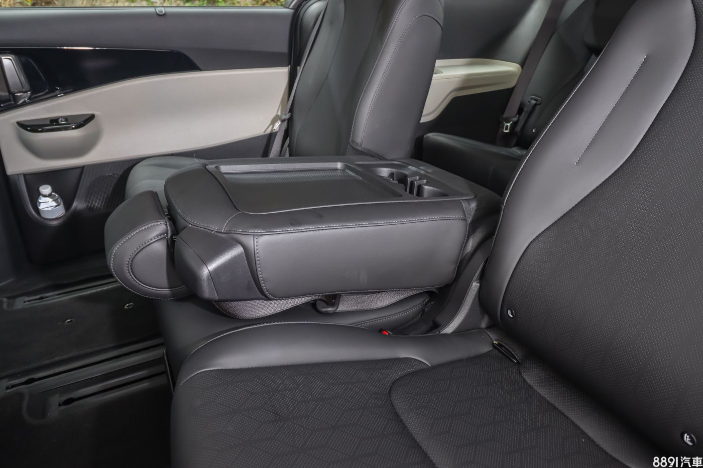 第二排中央座椅可倒平,當成置物平台與杯架,善用70cm前後滑移超大幅度,讓這張「桌子」也能為第三排乘客所用,可依照需求自由調配。