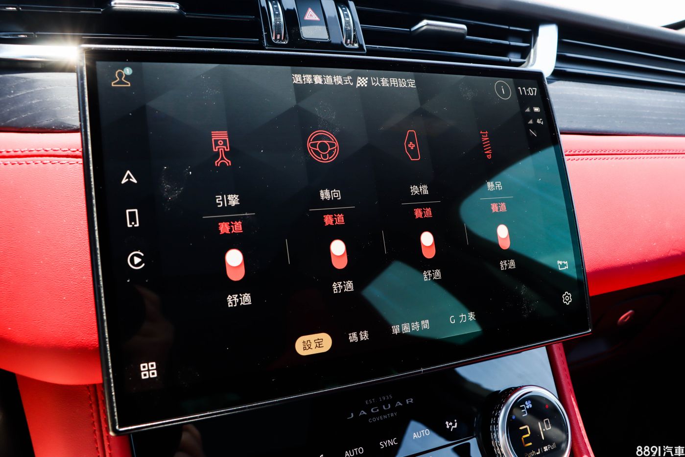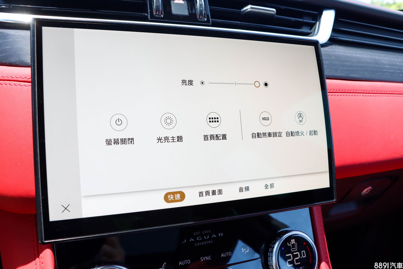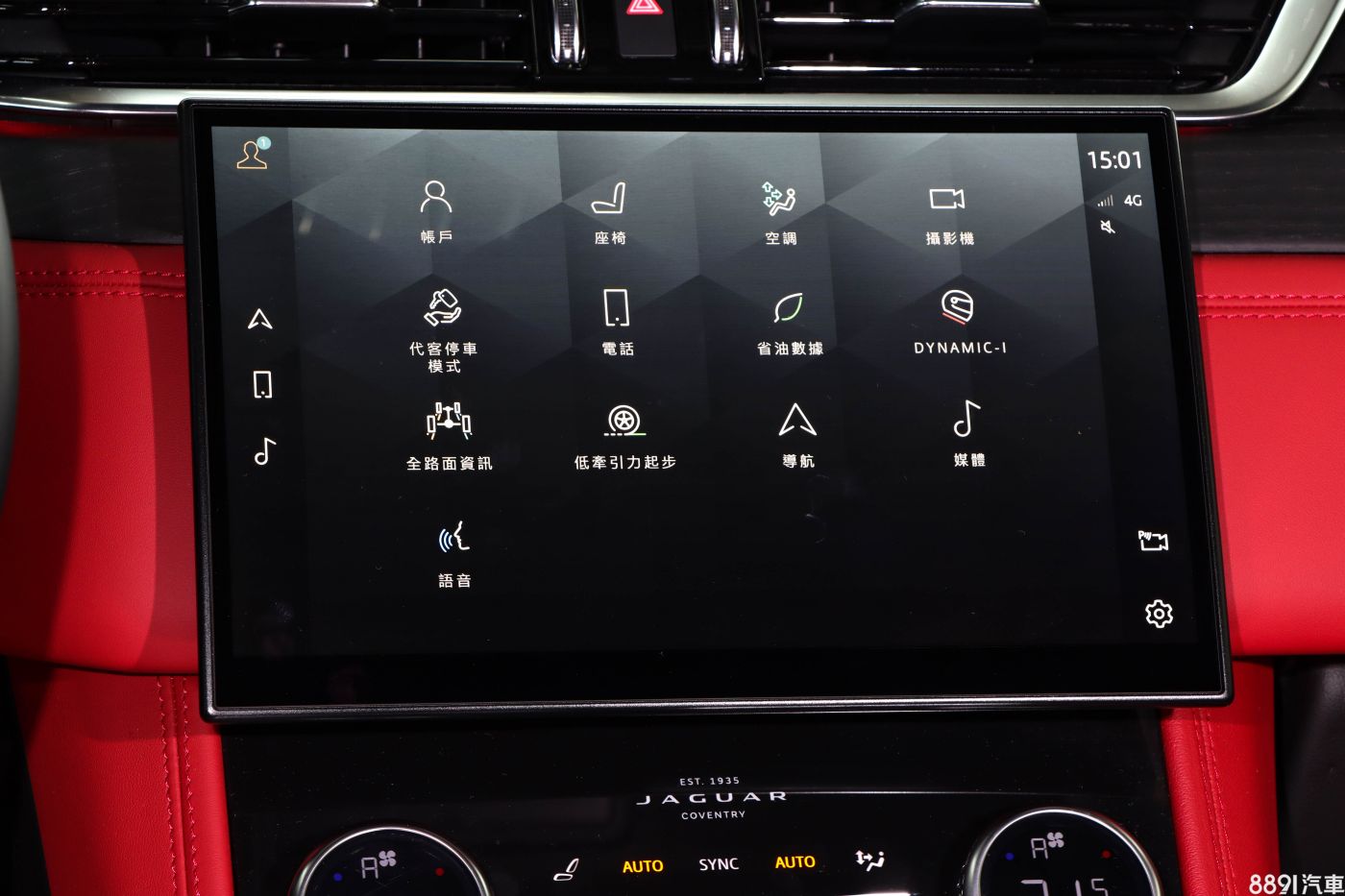 畫面除了黑色風格外,也有淺色主題可選。而配合數位化的設計理念,其他車款普遍採實體鍵鈕的自動剎車鎖定及自動引擎啟閉系統,在F-Pace上皆以螢幕觸控控制。
