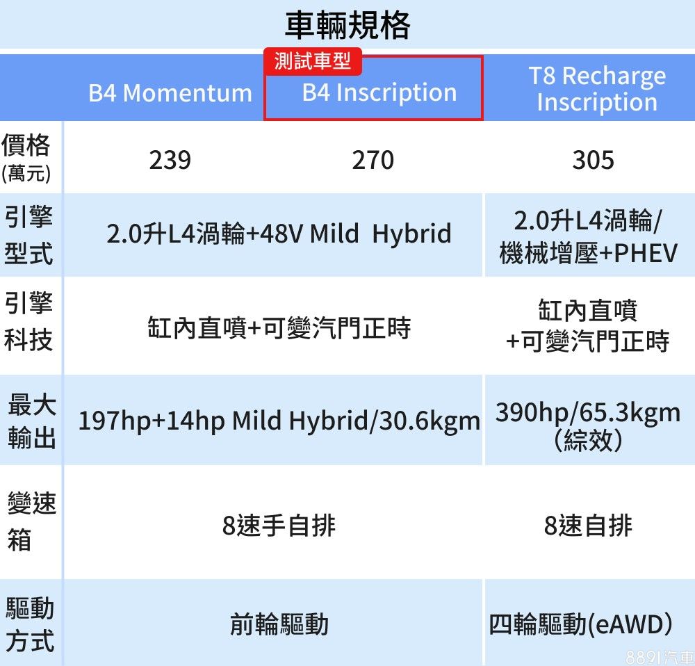 除了車身尺碼大幅增長,這回小改款還有另一項重點便是導入48V微油電系統,以往T4動力導入微油電後代號改稱B4,並提供入門Momentum與高階Inscription兩種配備車型。31萬價差主要體現在豪華配備,包括雙前座電動調整、四座通風加熱、側窗電動遮陽簾、Harman/Kardon音響、水晶排檔頭等配備都符合升級後的旗艦車格。頂規T8 Recharge Inscription則以390hp/65.3kgm PHEV複合動力為升級重點,並將頂級B&W音響系統納入標配。