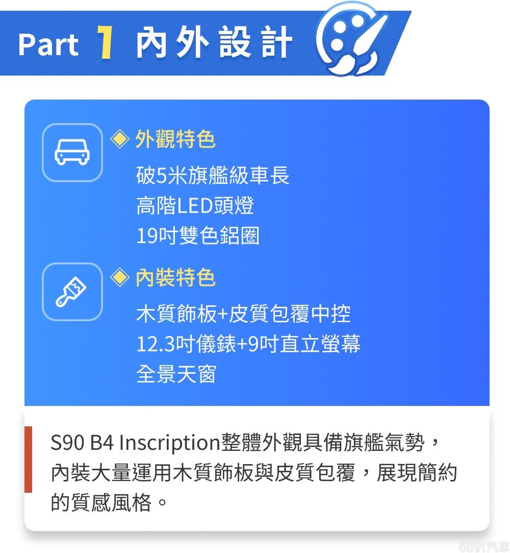小改款S90外觀更動細微,而讓人印象深刻的是,即便軸距大幅加長,整體視覺感仍是修長協調,若非小改款前後比鄰放在一起,其實很難看出車身尺碼大幅成長,設計功力相當了得。