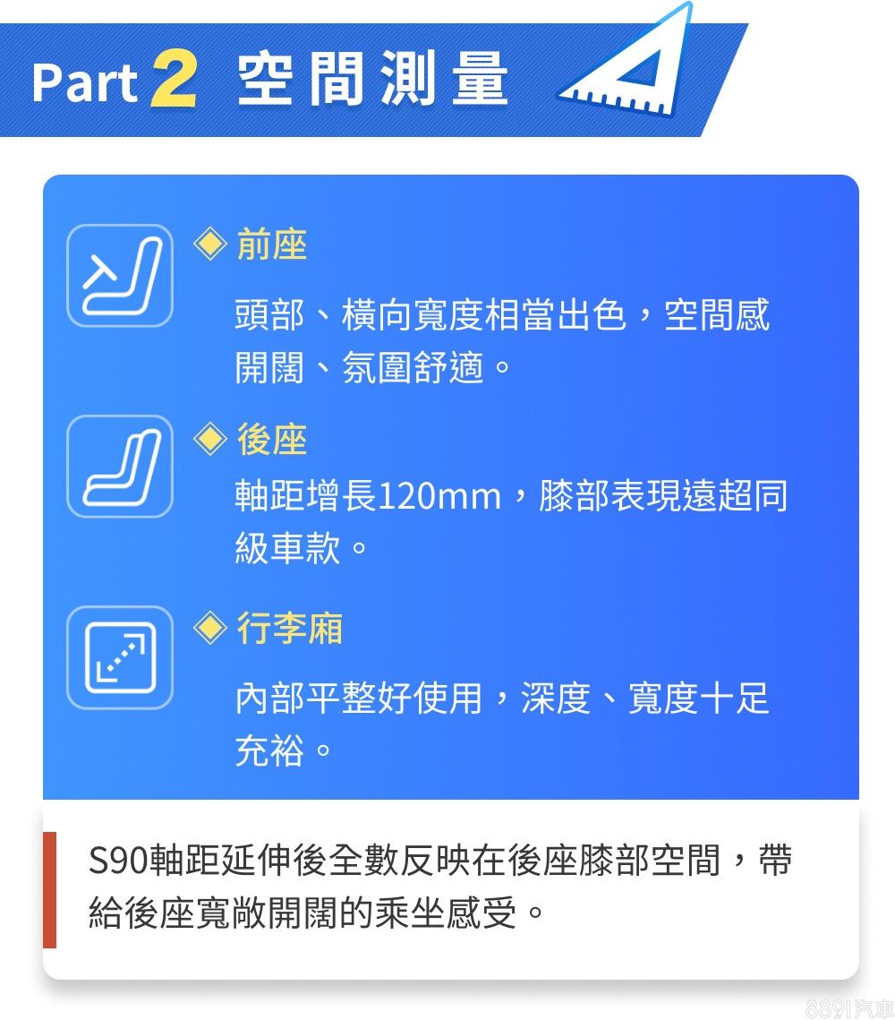 比照多數長軸版車型,S90後門尺寸也因應軸距而放大些許,帶來開闊的進出動線,雖然車門開啟角度不算太大、但進出便利性仍是讓人滿意。
