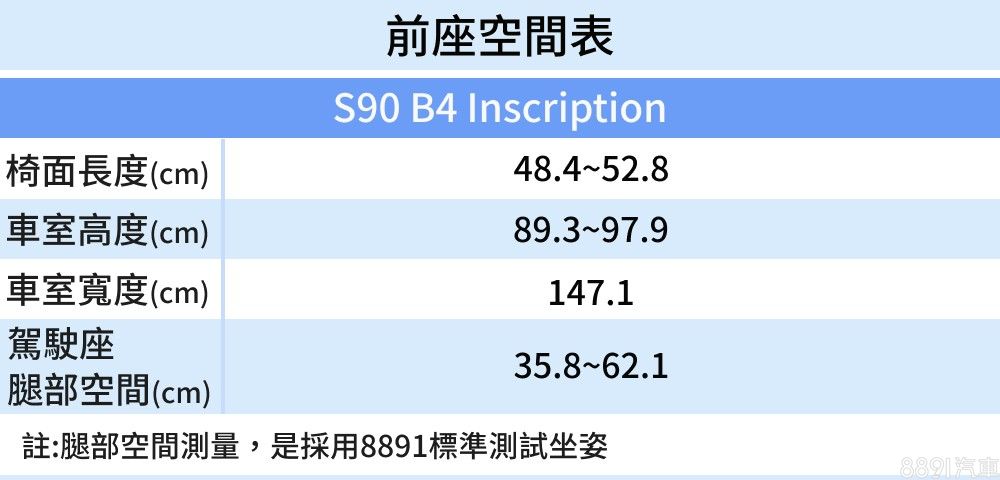 S90尺碼不小,乘坐空間自然是其強項,前座寬度、頭部空間充裕不說,座椅設計也能包容各種身材的駕駛人,前座滑移幅度頗大、腿靠也能向前延伸約4cm,不難找到寬敞舒適的坐姿。