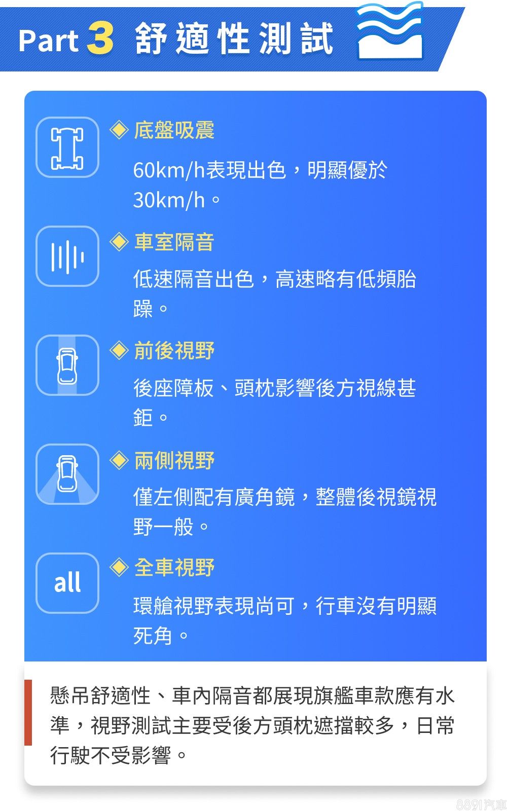 後座主要藉著膝部空間與大型中央扶手提供不錯的尊榮體驗,椅背角度、泡棉支撐設定同屬上乘,但椅面略短、也不具備後座電調是稍嫌可惜之處。好在也提供通風加熱機能,舒適度仍夠水準。