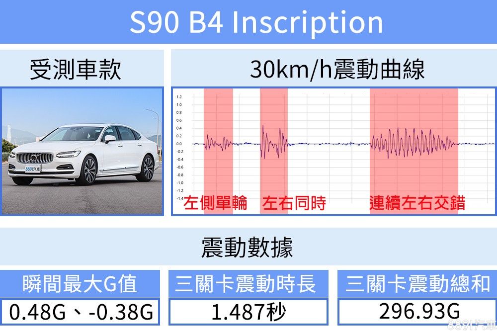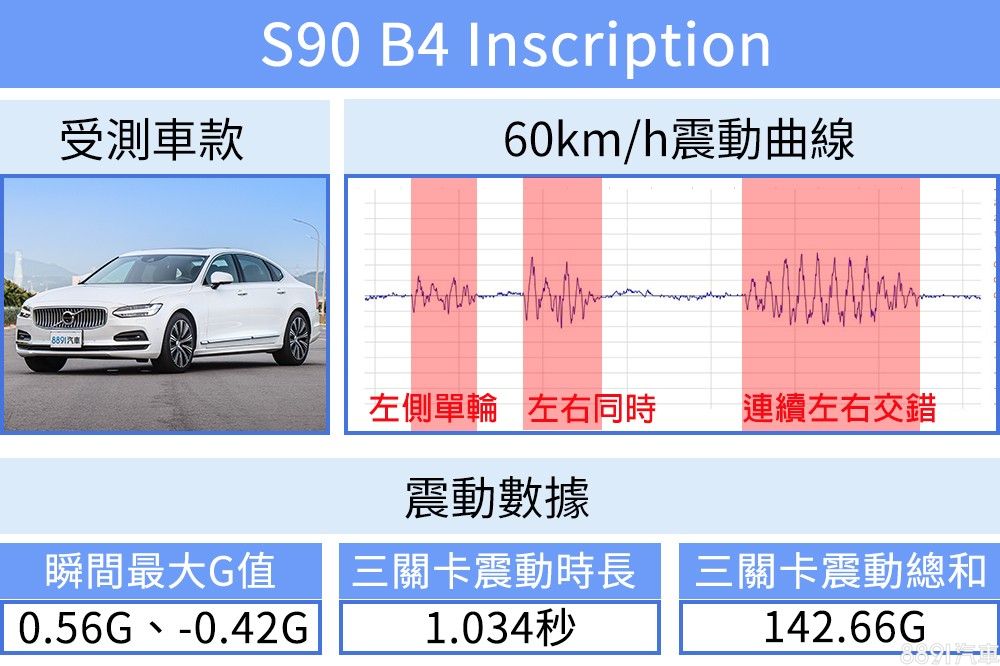 速度提高,S90徹底展現旗艦房車應有的舒適性,面對路面起伏車身回穩迅速、不疾不徐通過測試陣仗,震動時長短、數據總和也相對出色,帶來相當舒適的日常行車表現。