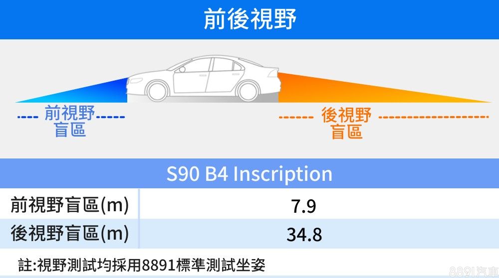 S90前視野出色,後方則如照片所示被三組頭枕遮擋大半視野,雖然行車過程中可將中央扶手放下,減少視覺干擾,但後障板設計略高、後方無論如何都稱不上視線良好,倒車時得放慢車速多方觀察才好。