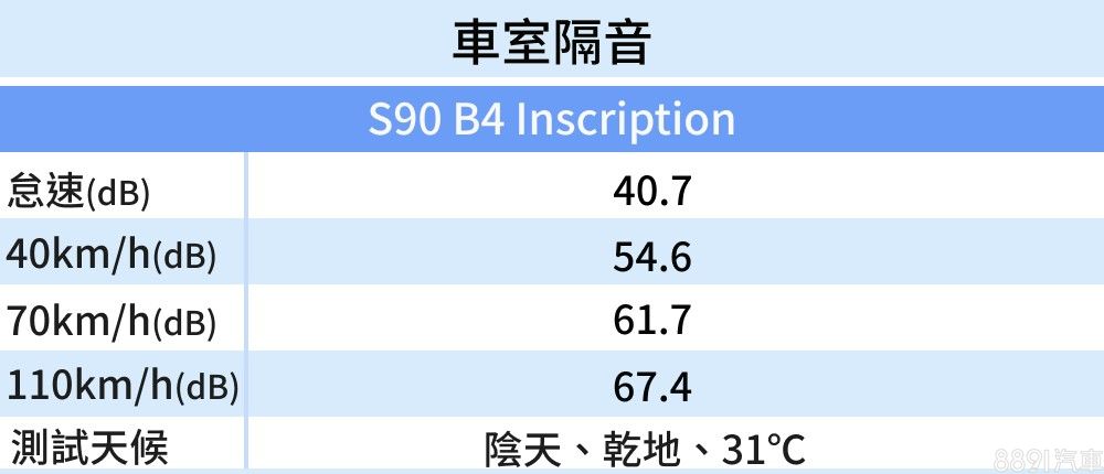 S90全車配置雙層隔音玻璃,可以有效將引擎怠速聲浪隔絕在外,車內沒有太多機件運轉噪音,靜止與低速行車隔音表現相當出色。隨著車速提高,輪拱傳來輪胎噪音便逐漸清晰,不過偏向低頻且單一的聲調並不惱人,實測數據表現也相對優異。
