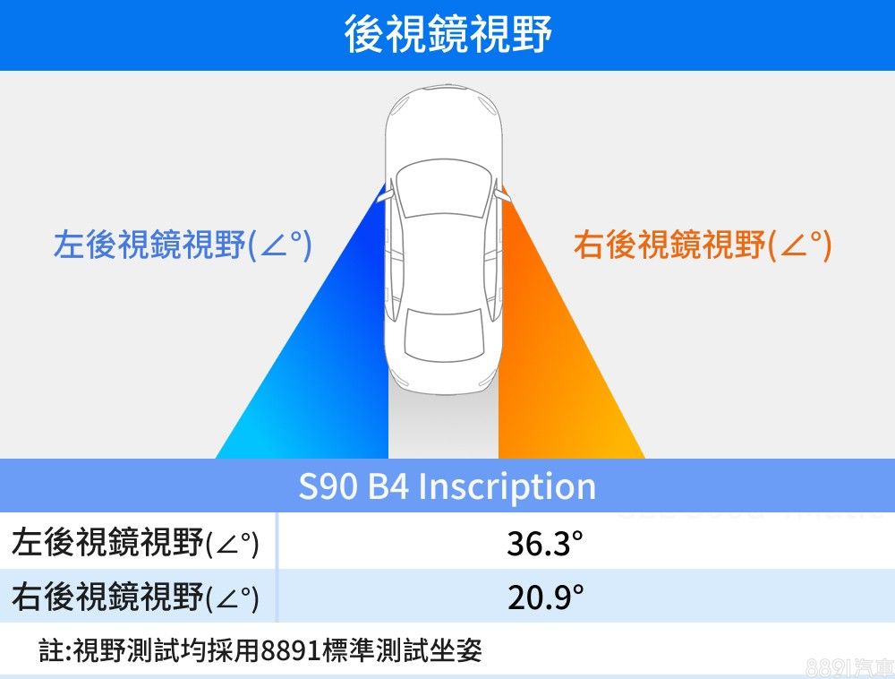 Volvo鏡片造型一向方正且面積夠大,利於掌握車身周遭環境,不過右側鏡片缺乏外緣廣角設計,照射角度僅20.9度,相對有廣角設計的左側便來到36.3度,差異不言而喻。