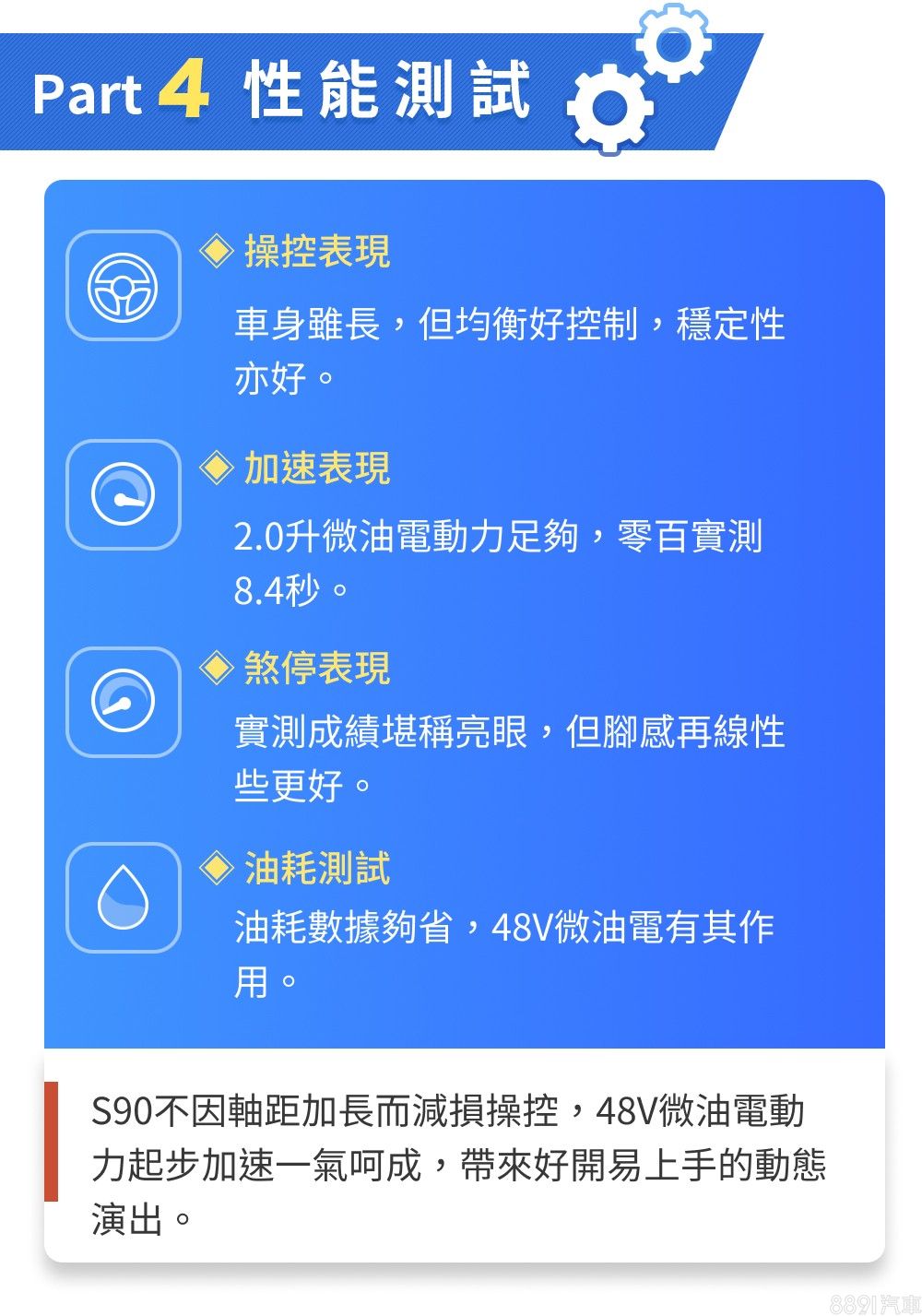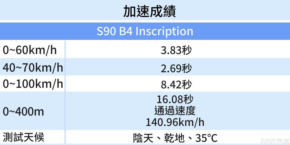 原本預期S90會因為軸距拉長而影響操控,但在賽道實測卻意外展現好開受控的一面,柔軟懸吊面對龐大車體依然保有支撐力,讓人能輕鬆掌握這輛5米大車,至於B4微油電動力輕快而充沛,實測8.4秒加速破百的實力相信能滿足多數買家的期待。幾天的試駕過程中,出色的質感與配備堆疊讓人樂於享受與S90的相處時光,再加上遠勝同級的空間與大器外型,是輛稱職、甚至超越期待的大型豪華房車。