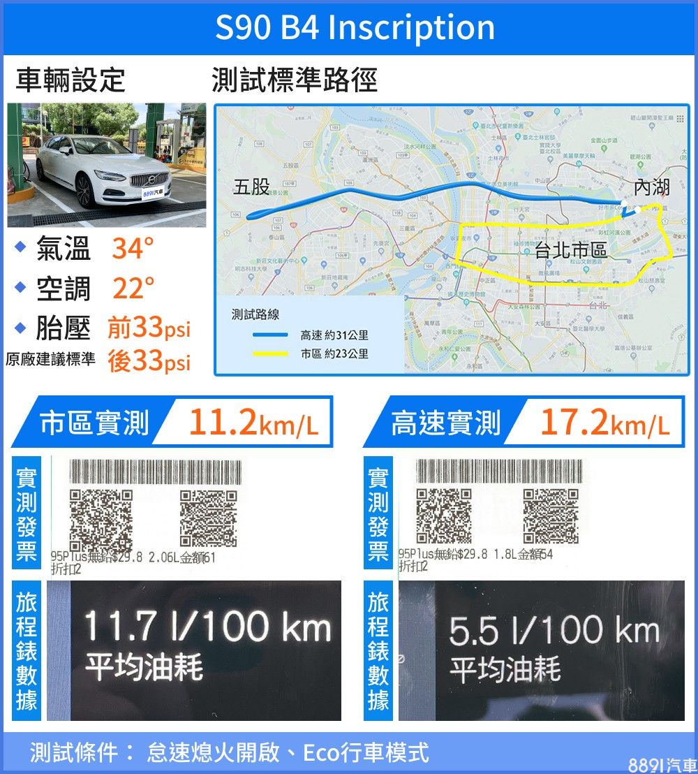 S90 B4起步輕快,過往T4動力略有遲滯的感受已不復存在,猜想是48V微油電馬達的功勞。油門稍稍踏下動力便適時展現,測試當天車流順暢、沿途都能以速限跟上車流行駛,即便怠速熄火並不如預期能長時間熄火停等,但最終仍測得11.2km/L出色市區油耗。高速油耗則歸功於8速手自排換檔邏輯出色,沿途幾乎以1500rpm左右轉速巡航便能跟上車流,創造17.2km/L高速實測成績,以一輛車重達1811kg的旗艦房車來說油耗表現相當出色。