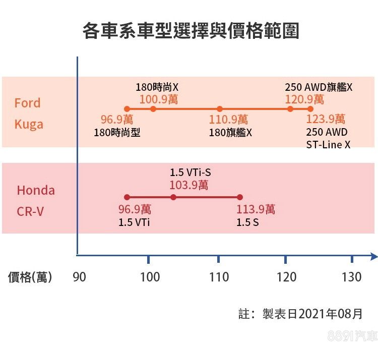 中型SUV市場向來火熱,目前在銷量上分屬國產中型休旅級距冠、亞軍的本田CR-V和福特Kuga,前者於今年5月針對入門車型調漲2萬;後者則於7月推出新年式,進行編成、售價與配備更動,致使兩車系入手門檻同樣來到96.9萬,相較CR-V單純反應成本因而調整入手價,Kuga新年式配備倒是有所升級,是否會讓兩者產品力有更明顯的區隔?讓消費者在做抉擇時更有利基點。