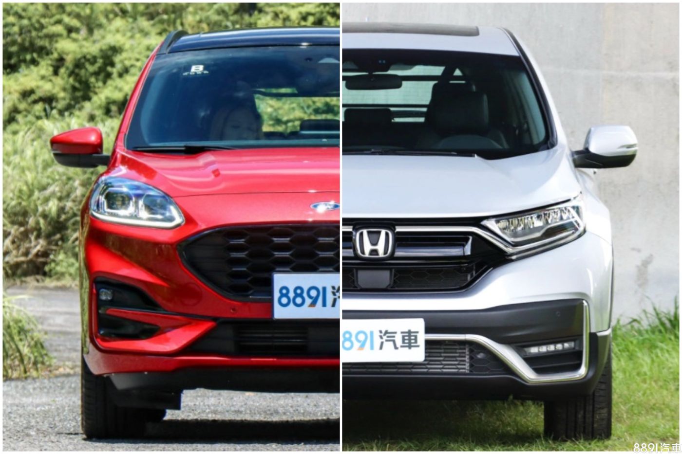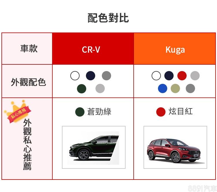 比起CR-V ,Kuga可選車色較多樣化,這邊推薦的是認為更能襯托兩車系外觀形象的塗裝,CR-V「蒼勁綠」除了特別,又頗具質感;Kuga的炫目紅則對運動氛圍的呈現有著加分效果。
