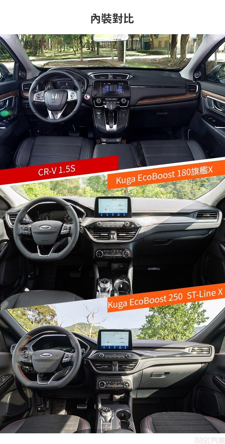 就車室格局而言,CR-V的中控台看起來更加清爽,不過此代問世以來頂規版本一直有的木紋飾板(其他為銀色式樣),容易給人較老派的感覺,是可惜之處;Kuga強項則在於透過旋鈕式排檔、抬頭顯示器和12.3吋數位儀錶(旗艦X以上標配)等配置,營造出較為強烈的科技感,而ST-Line車型在內裝也享有專屬設計,突顯運動氣息。