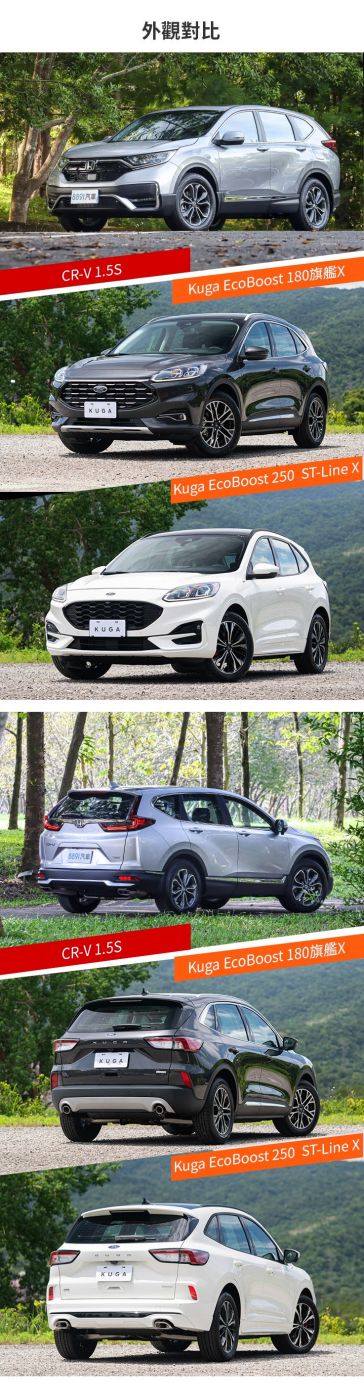 Kuga有ST-Line版本,藉由19吋鋁圈、新年式追加的紅色煞車卡鉗,以及專屬空力套件,妝點出不同於其他車型、更具動感氣息的扮相;CR-V各車型間外觀差異則多在於較細節處,如頭燈組、前霧燈光源設定,頂規版本以更多的鍍鉻材質,略微提升外觀質感呈現。兩相比較之下,Kuga車系在外觀呈現上顯然更富變化度。
