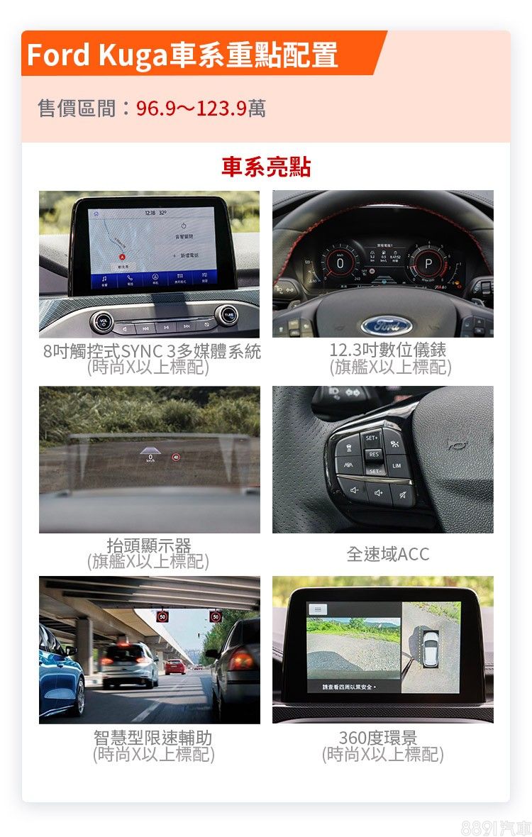 Kuga新年式取消原先入門車型,使得全車系均標配有ACC和車道維持的Co-Pilot 360,而除了入門版本,其餘車型增配360度環景、ISA智慧型速限輔助、RED道路邊緣偵測等,加上先前僅頂規有的12.3吋數位儀錶、Qi無線充電裝置下放至旗艦X版本,更突顯其科技配備的豐富程度。
