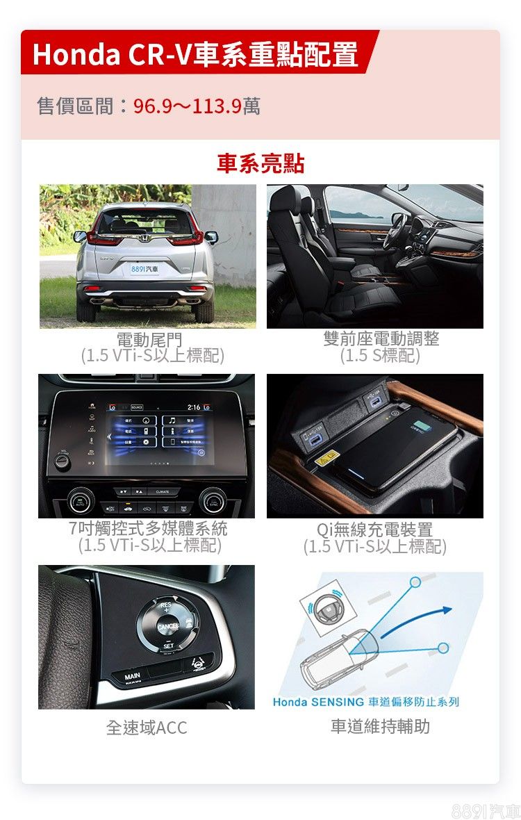 跟隨市場需求,把Honda Sensing列為全車系標配對CR-V的產品力加分這點無庸置疑,在外觀內裝配備方面各車型也都稱得上完善,之間重點差異僅在便利性配備,硬要說是入門版本沒有觸控式多媒體系統,感覺與其身價似乎不太相符。此外,CR-V還有一個先天優勢,就是品牌一向擅長的「大空間」,確實堪稱同級數一數二。