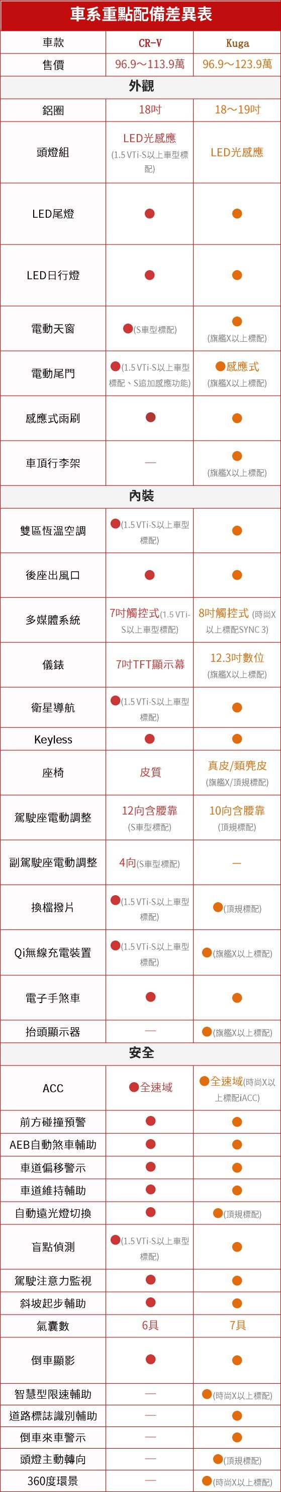 說實話CR-V配備真沒甚麼好嫌,但就拿國人目前關注度很高的主動安全來說,始終以Honda Sensing打天下的策略,相較不斷追加相關科技項目的Kuga,CR-V的主動安全科技配備豐富程度確實不如Kuga。不過Kuga倒也不是「完全制霸」,CR-V的大空間,相信坐過的人都很有感,這部分正是Kuga稍顯弱勢之處,要選配備C/P值、或是想擁有「國產休旅馬力王」的買家,建議投Kuga一票,但如果加入更多家庭使用上空間的考量因素,CR-V還是有著難以抵擋的魅力。