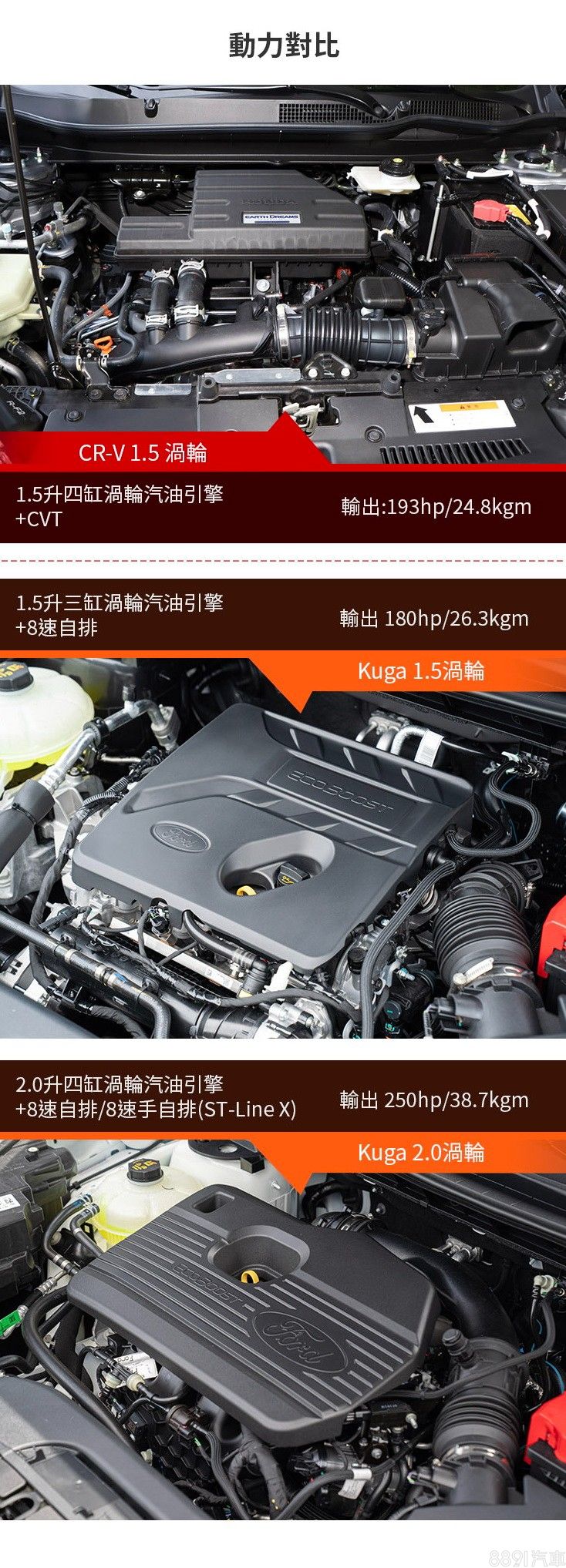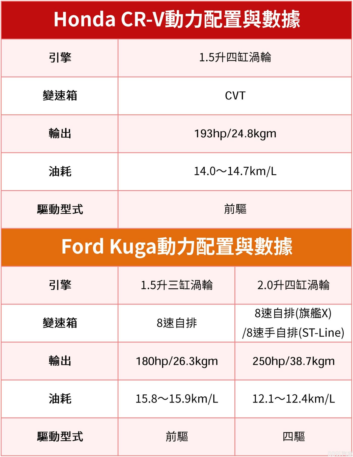 CR-V「很簡單」,採單一動力三車型選擇;相較之下Kuga除了符合小排量渦輪趨勢的車型,又多了此級距中少有的大馬力四驅版本,兩車價格帶已然進入部分進口中型SUV的射程範圍,除了品牌信任度,配備完整度、以及後續養車成本自然更加重要。