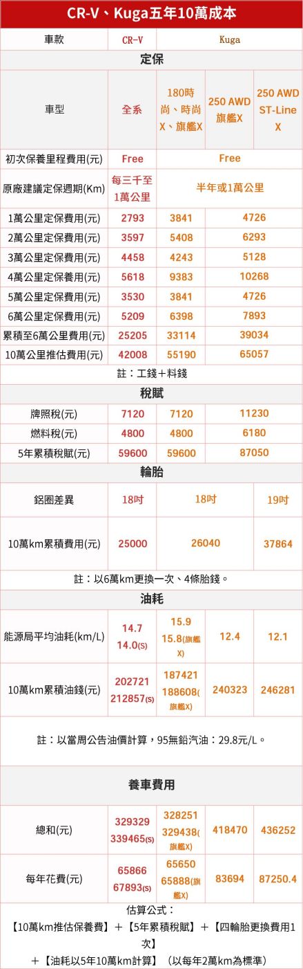 回到最實際的養車層面,兩品牌均無須擔心據點少的問題,在原廠定保部分,CR-V更加友善一些,即便兩車系在1.5升動力車型的油耗表現有點差異,最後成本還是不相上下,而Kuga 2.0升動力版本「比較難養」也在情理之中,畢竟性能、經濟難兩全。