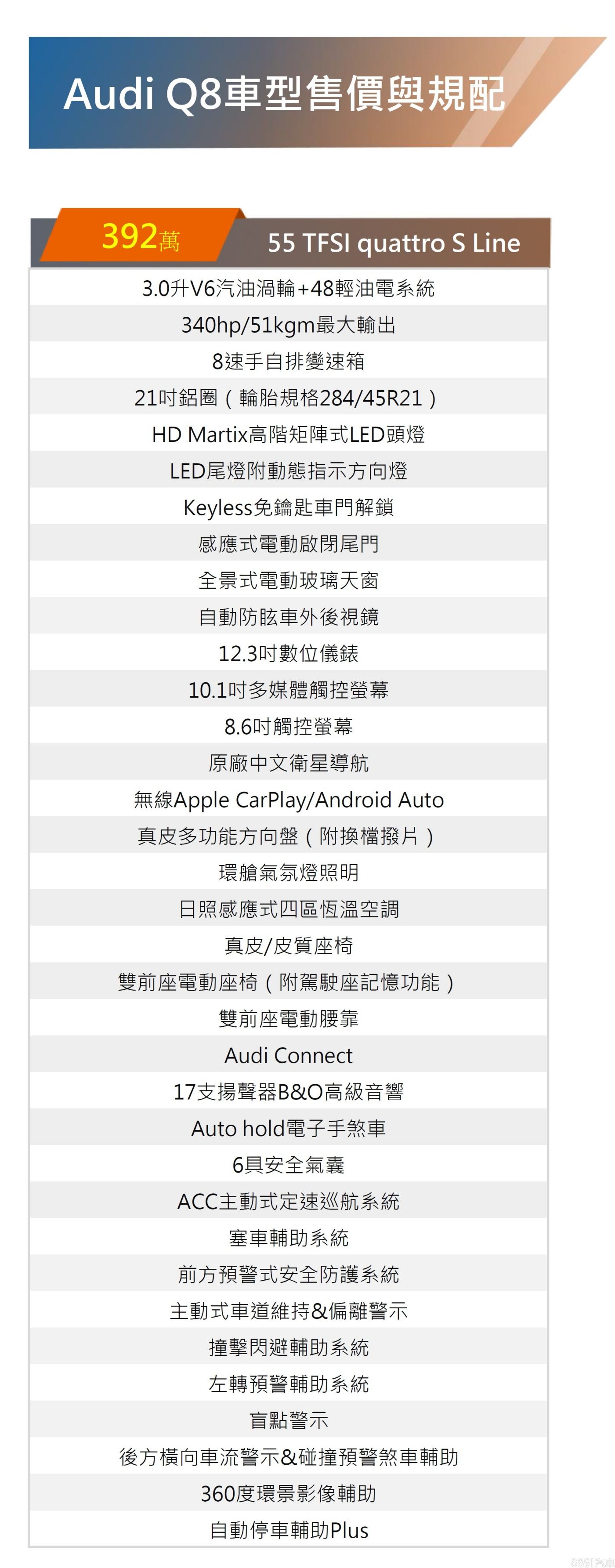 Q8國內採單一車型設定,除了身搭S line套件增添動感外,包含高階矩陣式LED頭燈、數位座艙、電動玻璃天窗、B&O音響、自動停車輔助皆納入標配,主動安全與實用配備已算齊全,對應齊旗艦休旅身分也算符合。