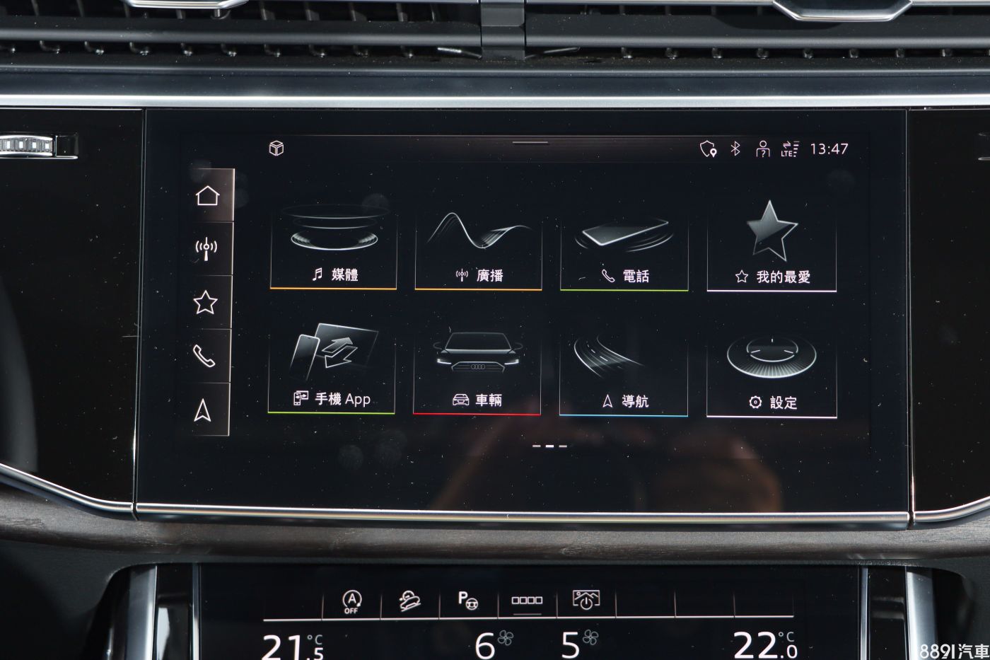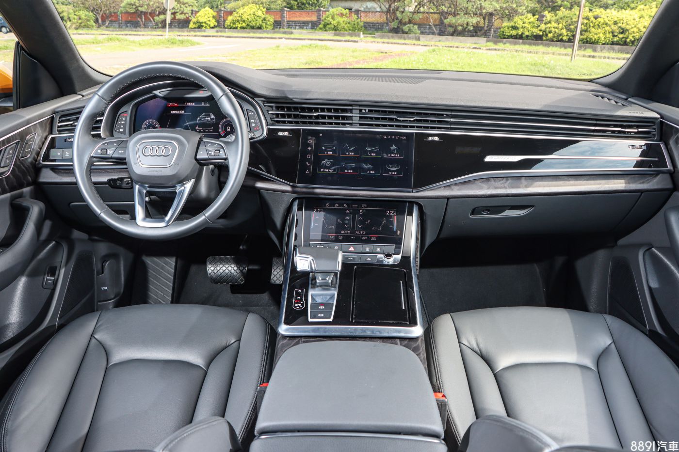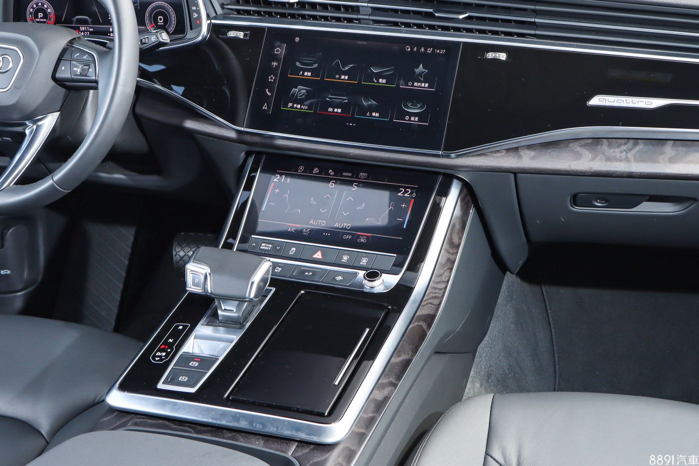 Q8內裝採用大面積鋼琴烤漆,輔以灰棕實木飾板、黑色織布頂蓬等鋪陳,搭配「三螢幕」的座艙配置,無論視覺或觸覺,質感上都屬出眾、有品味,科技氛圍也相當濃厚。