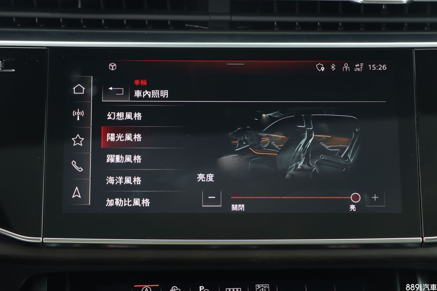 車室內配備有環艙照明氣氛燈,除了內建多種風格可以選擇外,也可透過個人化設定選擇燈色偏好,不過整體點亮效果較為內斂,不若賓士同級車款那般「虛華」。