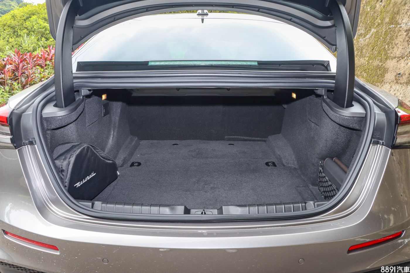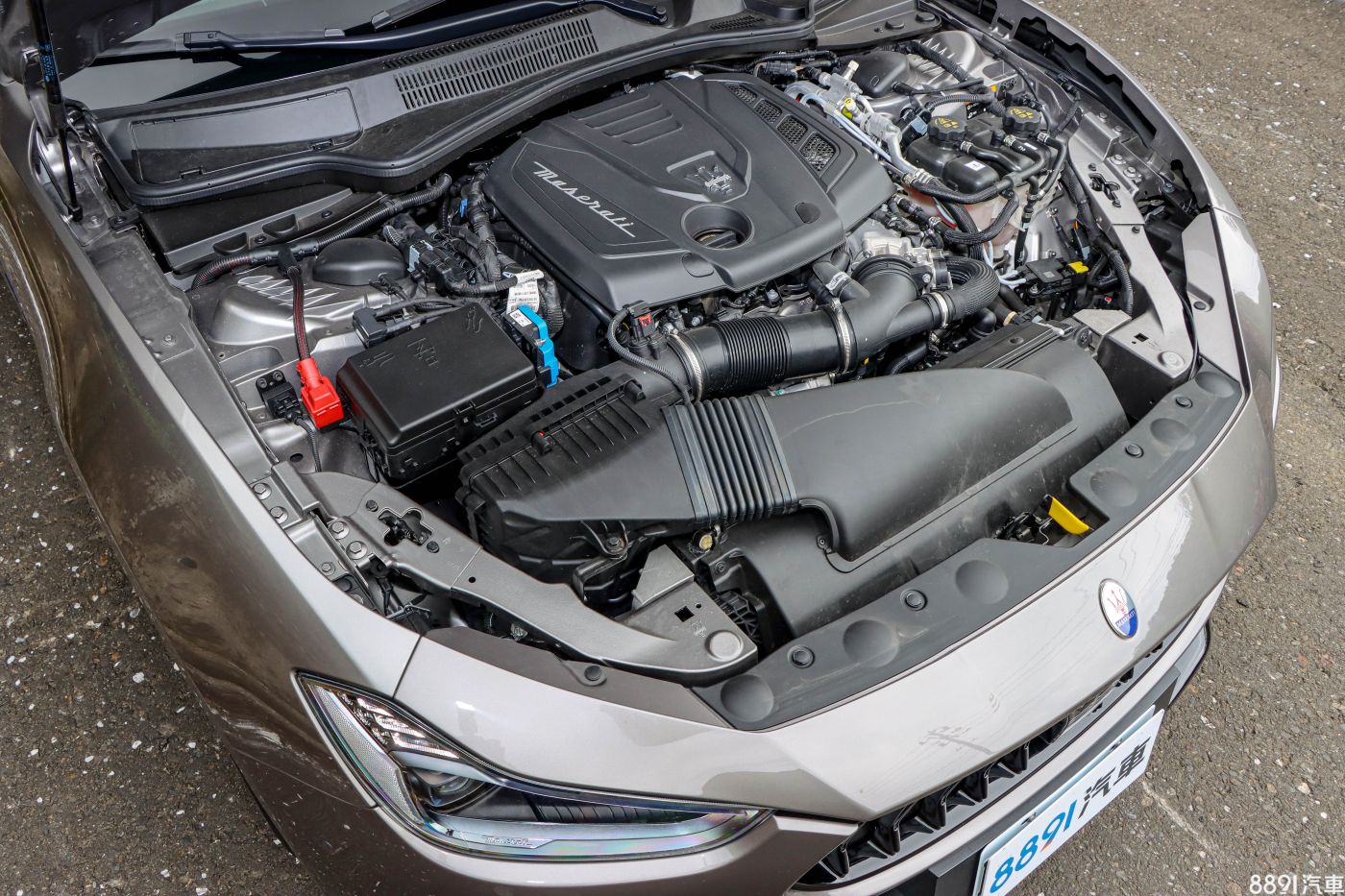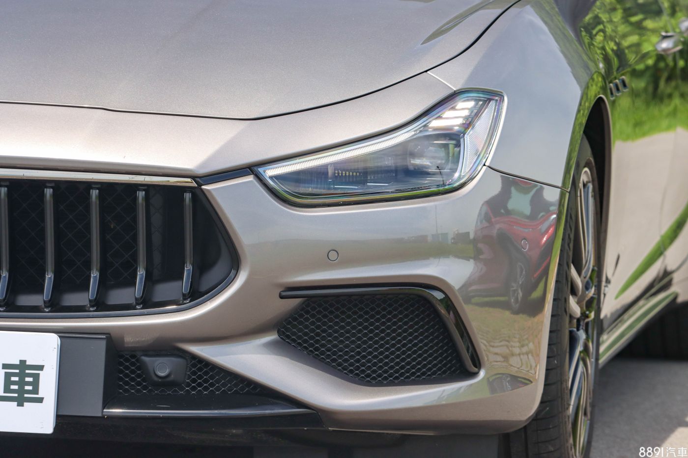 GranSport車型和基礎板有明顯差異,有專屬的保桿造型,下氣壩與兩側進氣口採用網狀設計,運動氣息更強烈,也符合Ghibli本身的兇悍神情,而試駕車選配15萬元的Nerissimo湛黑套件,包含水箱罩隔柵、後視鏡和窗框飾條均為黑色塗裝,和淺棕的金屬車色蠻搭的。