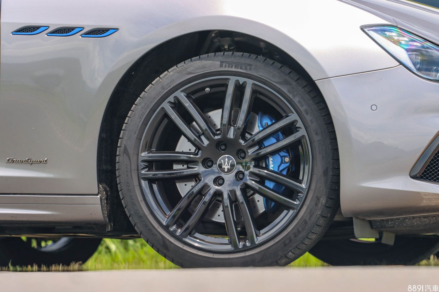 因應輕油電系統的節能印象,Ghibli的葉子板開口和C柱廠徽都採用藍色塗裝,相同色系的煞車卡鉗則要另外花5萬元選配,而圖中的亮黑色20吋輪圈包含在Nerissimo湛黑套件,配胎採用前245/40R20、後285/35R20的倍耐力P-Zero跑胎,性能表現對應330hp動力很足夠。