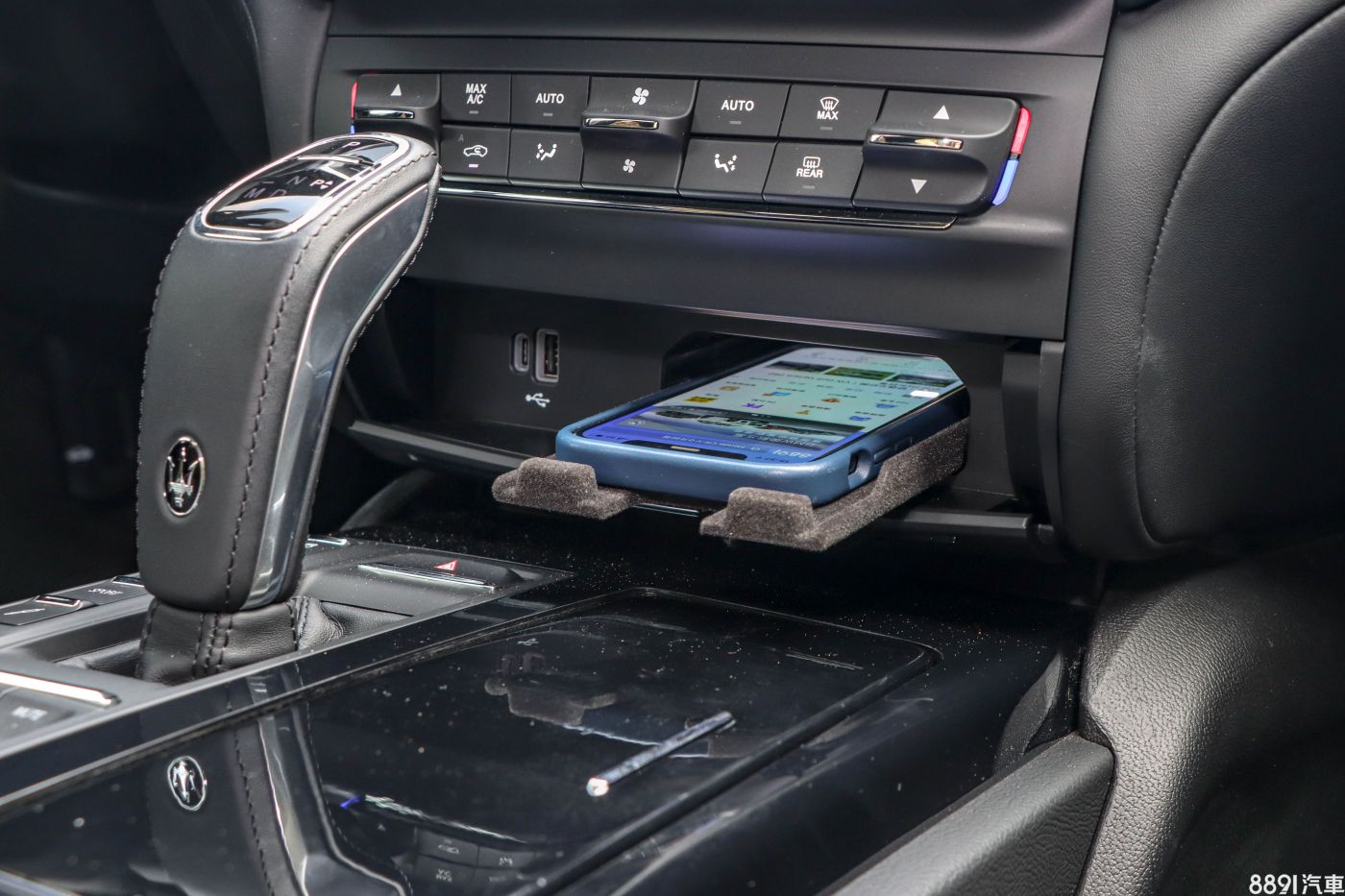 空調下方的蓋板下提供USB介面和GranSport版本標配的無線充電座,使用按壓彈出的伸縮機構,隱身在緊湊空間中,使用上需要稍微習慣,如果取放手機的頻率較高略嫌不便,但這也是在既有架構下增加的功能,可以理解。