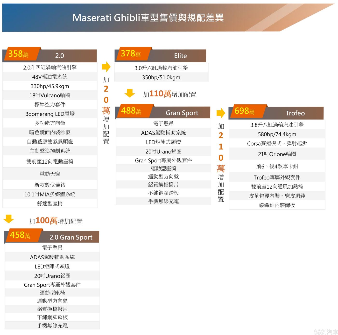 Ghibli 2.0是台灣市場特有名稱,主要讓消費者更容易區別等級差異,原廠資料叫做Ghibli Hybrid,一開始在國內上市則是Ghibli MHEV,說的都是同一件事,屬於車系入門動力,基礎款式的Ghibli 2.0售價358萬元,而這次主角是高階版本Ghibli 2.0 GranSport,配備更豐富,價格也來到458萬元,試駕車加上選配之後為585.5萬元。
