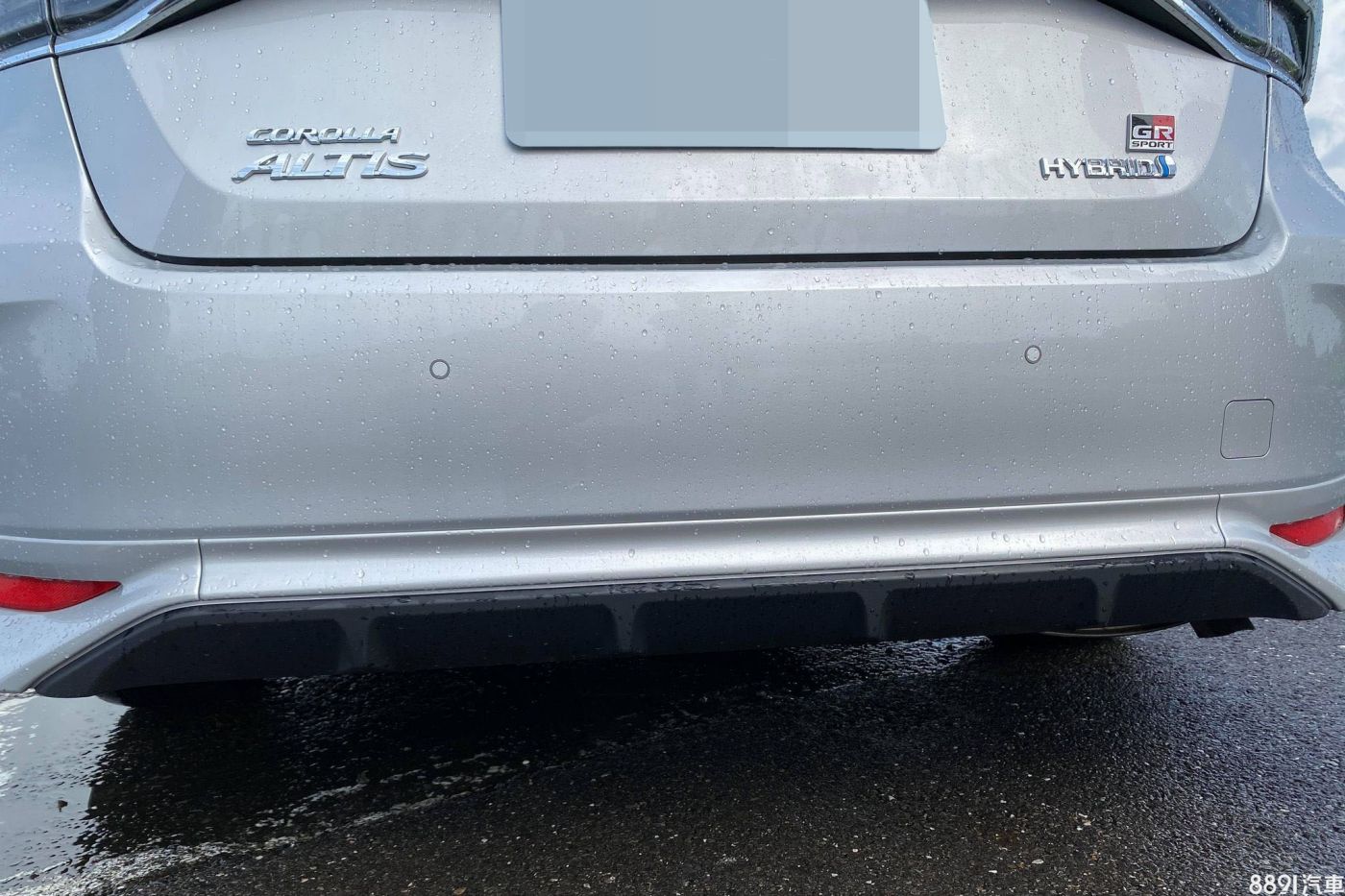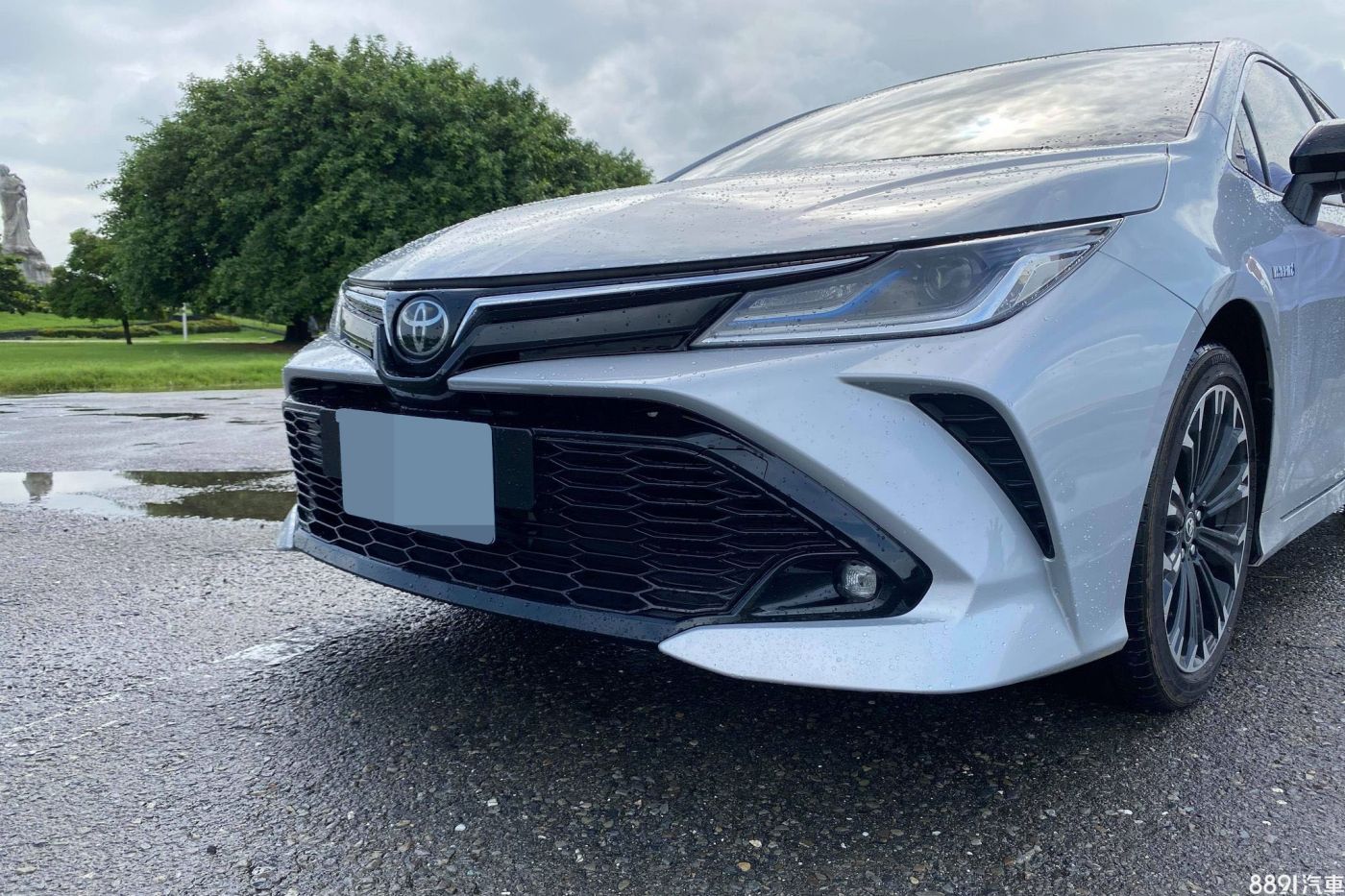 首先從外觀看起,Altis GR比在一般路上常見的12代Altis多了更大型的前氣壩與水箱護罩,輪拱前方還有裝飾用的進氣孔,為整體車輛的運動表現加了不少分,另外也因為其油電車的身分,因此在大燈內部也裝上了代表著油電車型的藍色飾條。