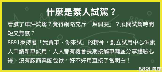 平時喜歡看車的我,最常使用的就是8891汽車APP,之前有意無意看到正在舉辦素人試駕的活動,沒想太多就給他報名下去,沒想到連我這樣的素人也能在第二次報名時就非常幸運的被抽中,獲得試駕新車一週的體驗機會,這樣就足以證明了這個活動確實不是內定,而是報名後真的有可能會被抽到的!