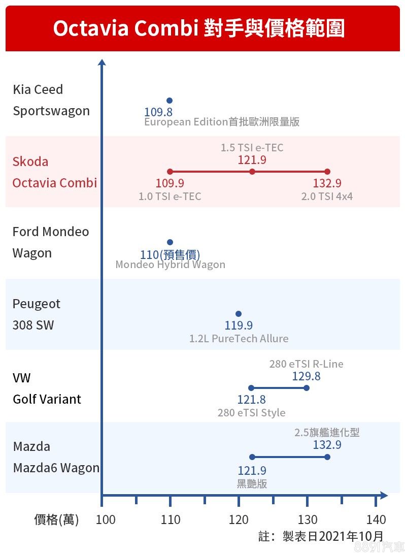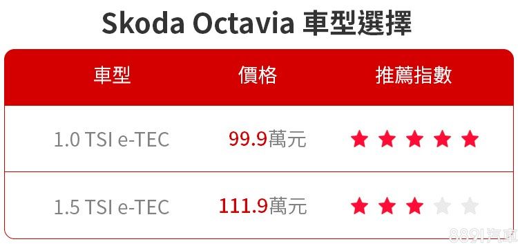 新一代車系維持供應斜背版的Octavia和旅行車型Octavia Combi,兩款式分別以99.9萬及109.9萬為門檻,入手價雖說較前代略有小漲,但也提供更豐富的車型編成,全車系一共有5種選擇。其中,除了Combi專屬的四驅款外,旅行車型售價皆較同動力之斜背款貴10萬元,各等級由於主要以動力配置區分,也因而依此命名。