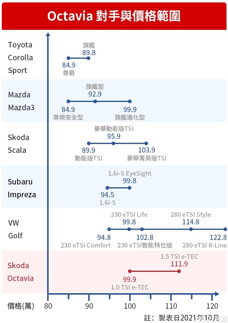 採Liftback斜背設計的Octavia,國內鮮有相同車體風格的直接對手,因此定位上常被和車格相近且市場熱門的中型進口掀背來比較。價格帶的分布,或許是為同家Scala保留發揮空間,因此對比下來Octavia大概落在中上價位,尤其與日系對手相比有著較明顯的價差,但策略設定則與Golf非性能車型相仿,讓主力專攻100萬左右的預算客群。