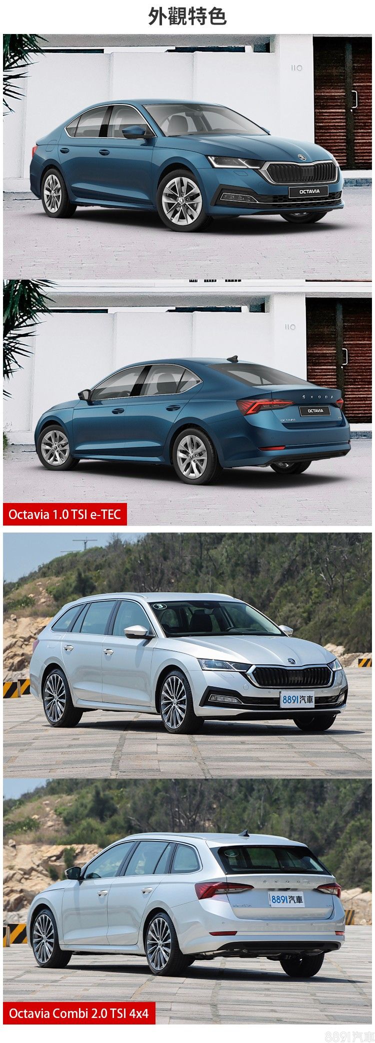 車系在大改款後,沿用不少與Scala或Superb相仿的視覺元素。不論Octavia或Octavia Combi,國內上市車型皆採統一風格,且無顯著配備差異,因此除了鋁圈造型外,車型間沒有明顯的可識別處。做為旅行車型的Combi,則受惠於較方正的尾廂設計,在標準五座配置下較斜背款多了40L的容積表現,達640L,至於電動尾門則入列全車系標準配備。