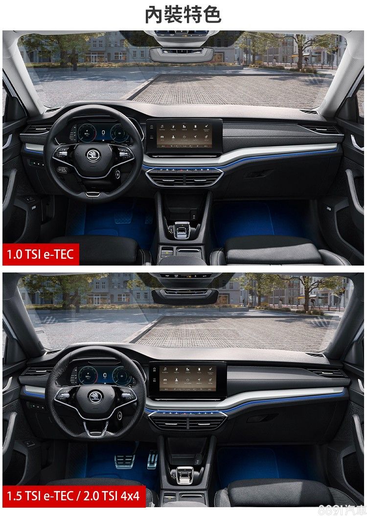 新一代Octavia除了減少實體按鍵數量,也由於換上小型排檔桿和電子手剎車,整體座艙顯得簡約開闊。由於配備相當,車型間在視覺上沒有顯著變化,如10.25吋數位儀錶及10吋觸控多媒體系統皆入列全車系標配,唯1.0車型採雙輻圓形方向盤,而其餘四缸車型皆換上平底運動化方向盤,是少數可供車型辨識的差異處。