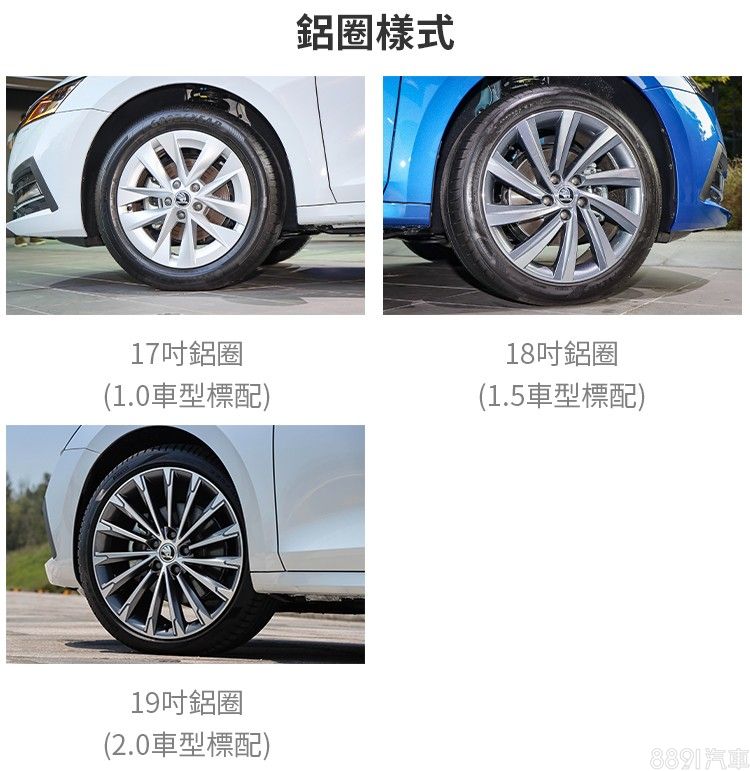 大改款Octavia按動力配置分別搭配不同規格的鋁圈,入門的1.0車型配備17吋單色款,搭配著造型立體的輪輻設計來添點視覺變化。1.5車型則改採雙色塗裝的18吋款式,2.0頂規則換搭專屬的19吋款,造型與視覺感自然是三者之中最佳的。