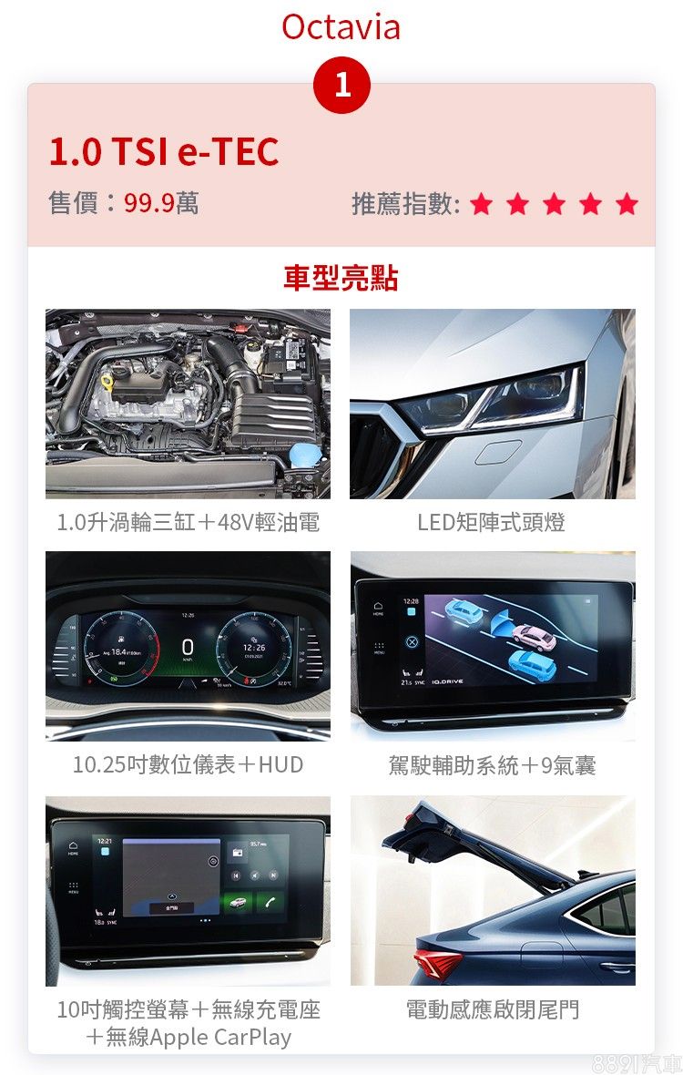 確實頂規配備更豐富,但依循「買車大補帖」一向以安全性及實用性做為主要衡量標準的慣例,我們仍認為入門款Octavia最具C/P值!新Octavia入門即標配完整駕駛輔助系統、被動安全配備、具自動光型遮蔽的LED頭燈和電動尾門等,座艙數位化也相當有感,在雙螢幕介面外,另有HUD抬頭顯示器,且針對蘋果手機用戶,也能實現「真無線」的手機連結服務,搭配不用百萬有找的入手價,能獲得5星推薦並非沒有道理。